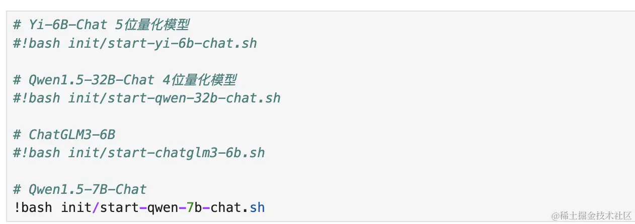 程序默认加载的是阿里开源的 Qwen1.5-7B-Chat 模型,你也可以更换别的模型,只需要去掉命令前边的“#”,注意同时只能加载一个模型,其它模型不使用时,请使用“#”注释掉。