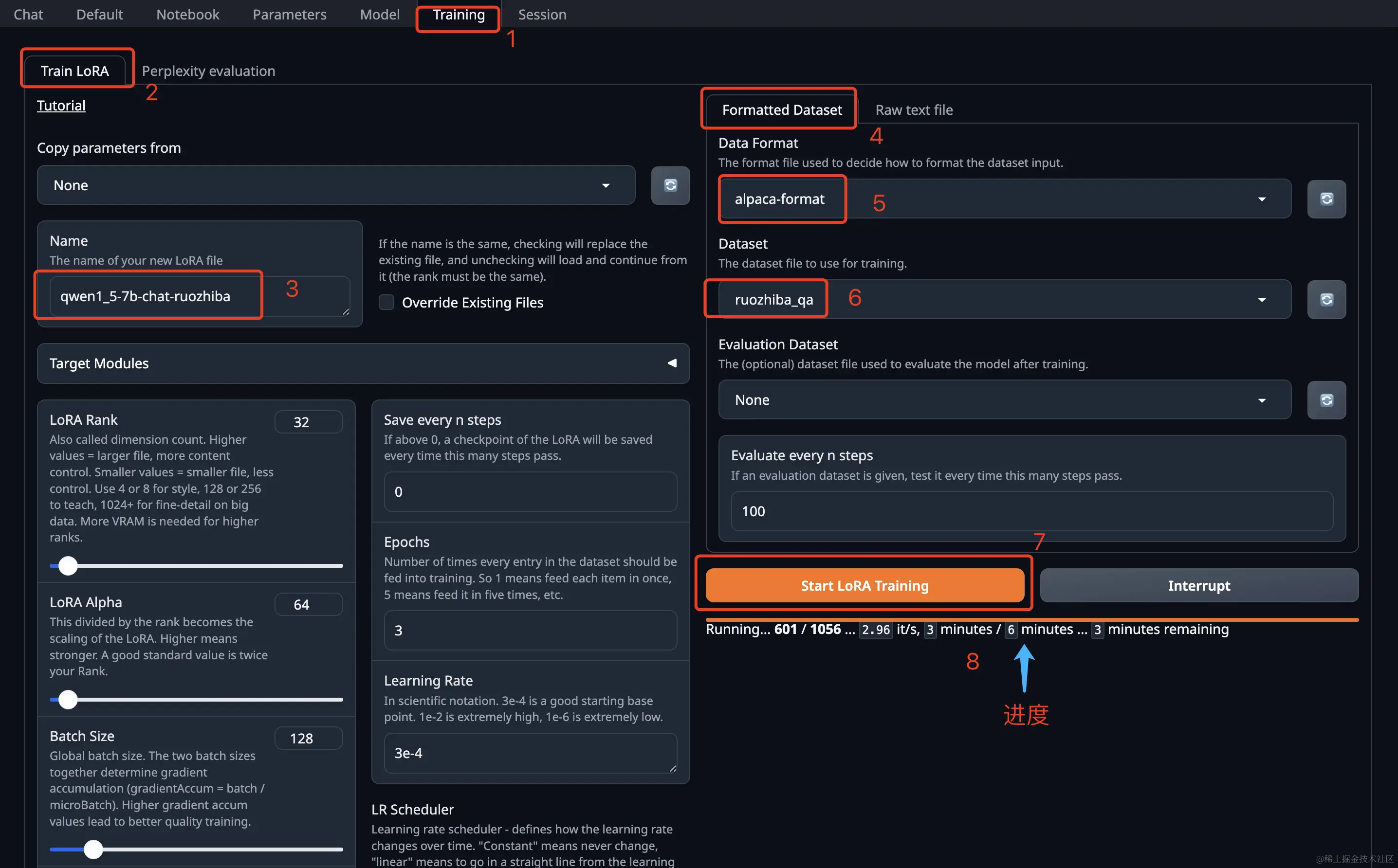 我们先来快速的过一遍训练过程,请按照下边的步骤开启LoRA训练: