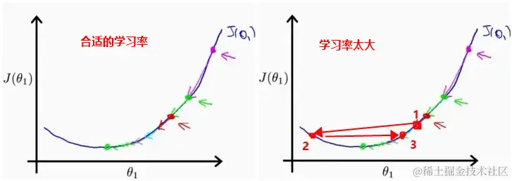 学习率。机器学习在训练过程中会不断检查自己与训练数据的偏离程度,它有个名词叫损失(loss),一个合适的学习率会让损失逐渐收敛在一个最小值。如果学习率太大,步子就会迈的太大,不能获取较好的效果;但是如果学习率太小,又会训练的很慢,成本太高。如下图所示:
