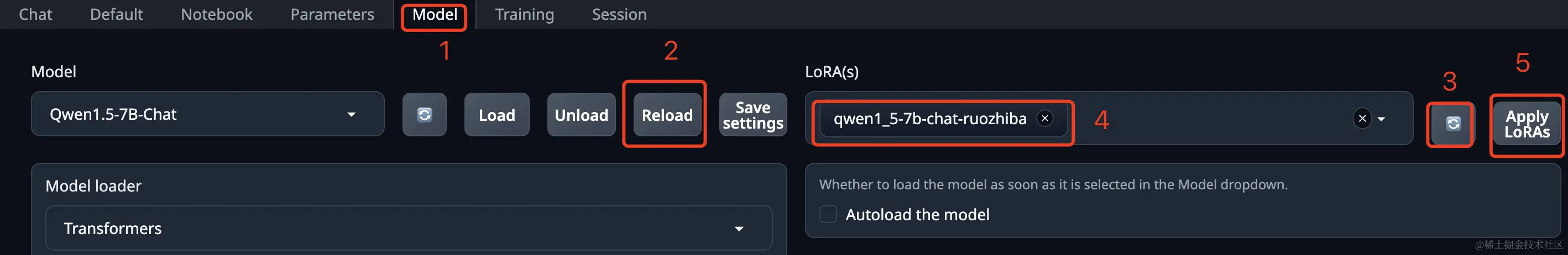 训练需要一个基础模型,镜像默认加载的是 Qwen1.5-7B-Chat。你也可以在WebUI中更换别的模型(前提是已经下载到模型目录),在 Model 页签这里选择别的模型,然后点击 Load 加载它。