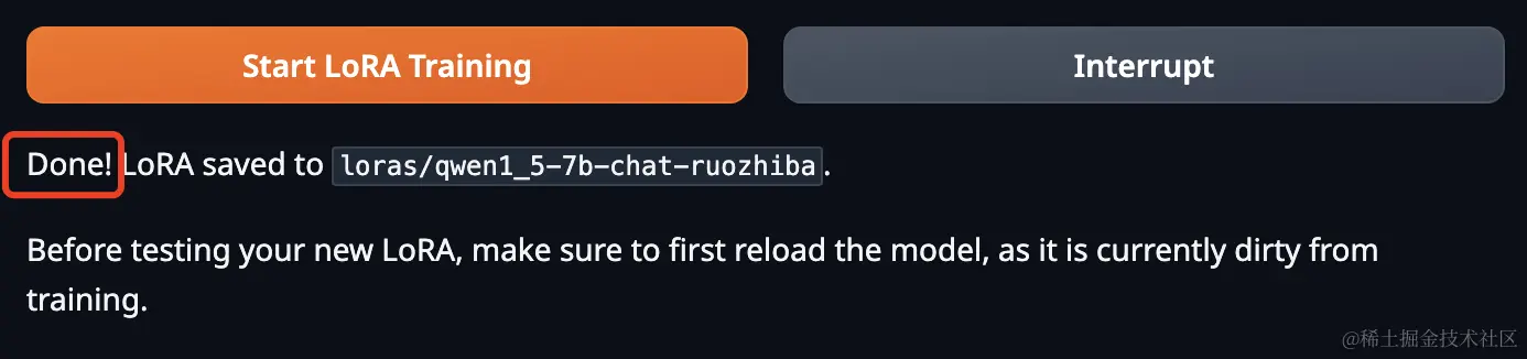 训练完成后,这里会显示“Done”。注意这里有个问题:如果WebUI和服务器断开了网络连接,这里就不更新进度了,此时可以去 AutoDL的 jupyterlab 或者你的命令界面中查看训练进度。