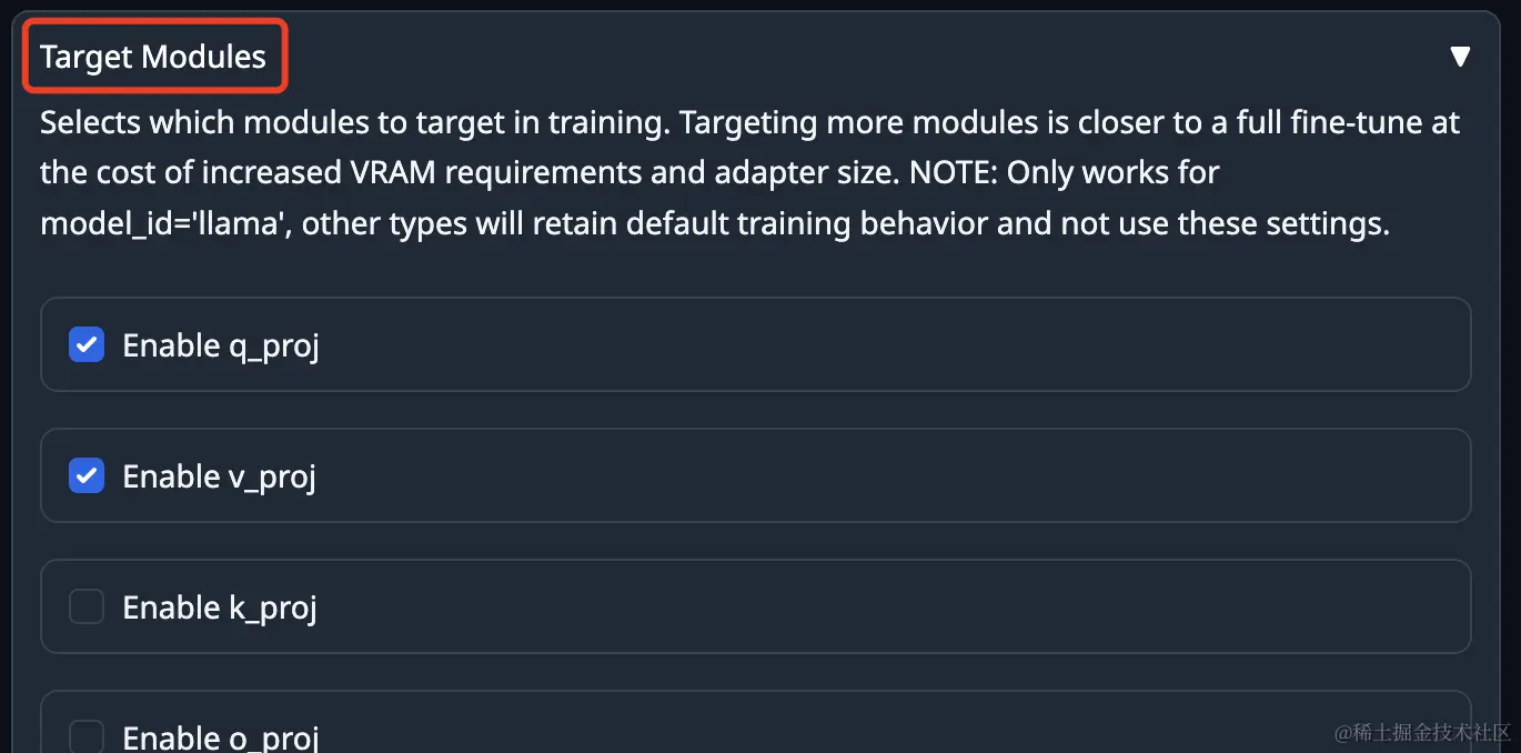 这个参数仅针对 llama 类型的模型结构,默认勾选的是 q_proj 和 v_proj,具体的名词不容易理解,我就不多说了,可以简单的认为是对模型的理解能力进行优化,一般这两个就够了。当然我们可以勾选更多的项目,优化模型的生成效果。但是可能会导致两个问题,一是训练要使用更多的资源,更慢;二是可能导致过拟合问题,也就是只在训练的数据上表现的好,面对新问题就不灵了。Qwen1.5-7B的模型结构也是llama类型的。