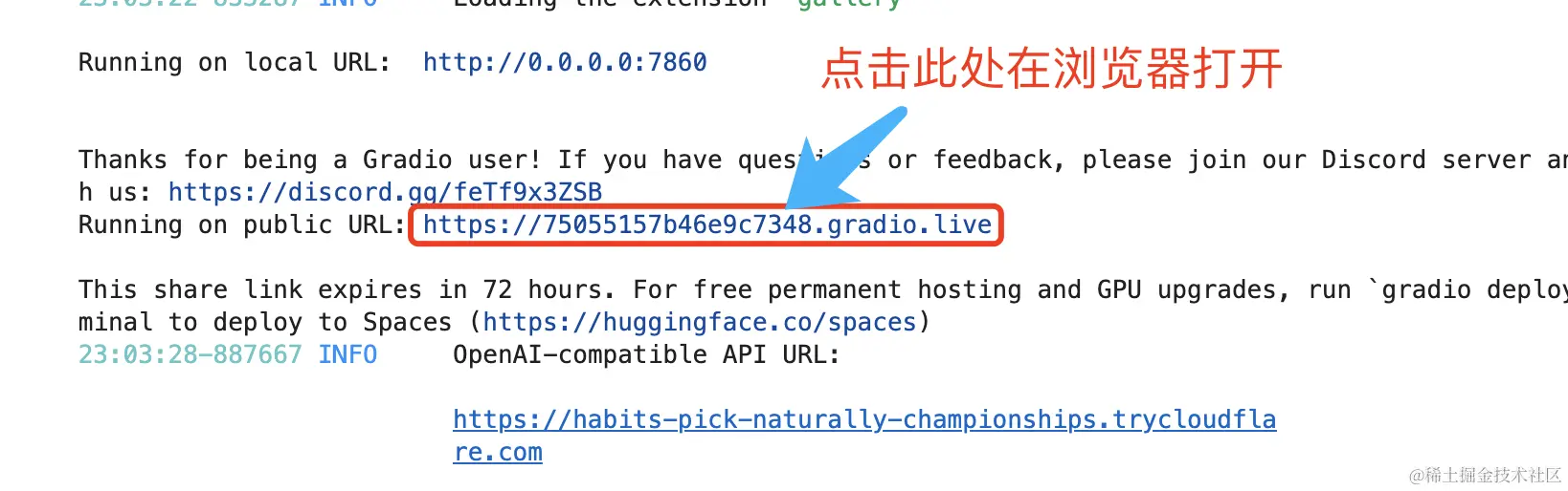 6、在下方的日志中看到类似输出的时候,就代表启动成功了。其中的 xxx.gradio.live 就是WebUI的链接,点击就可以在浏览器打开它的使用界面。