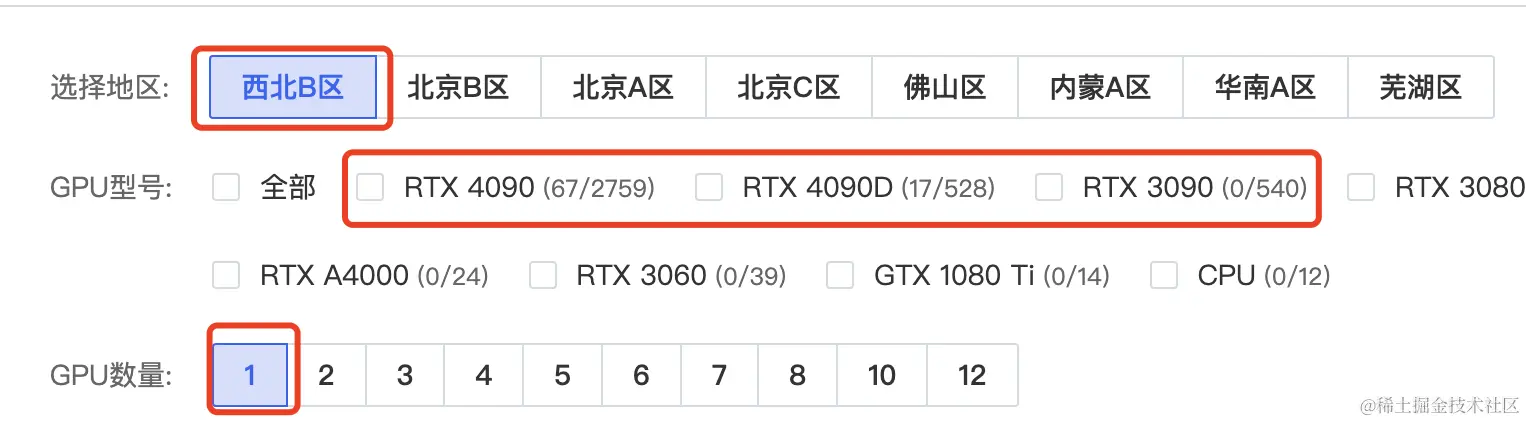 2、GPU型号:最好选择 3090 或者 4090。因为大模型需要的显存一般都不低,6B、7B的模型做推理都需要15G左右的显存。GPU数量选择1个就够了。