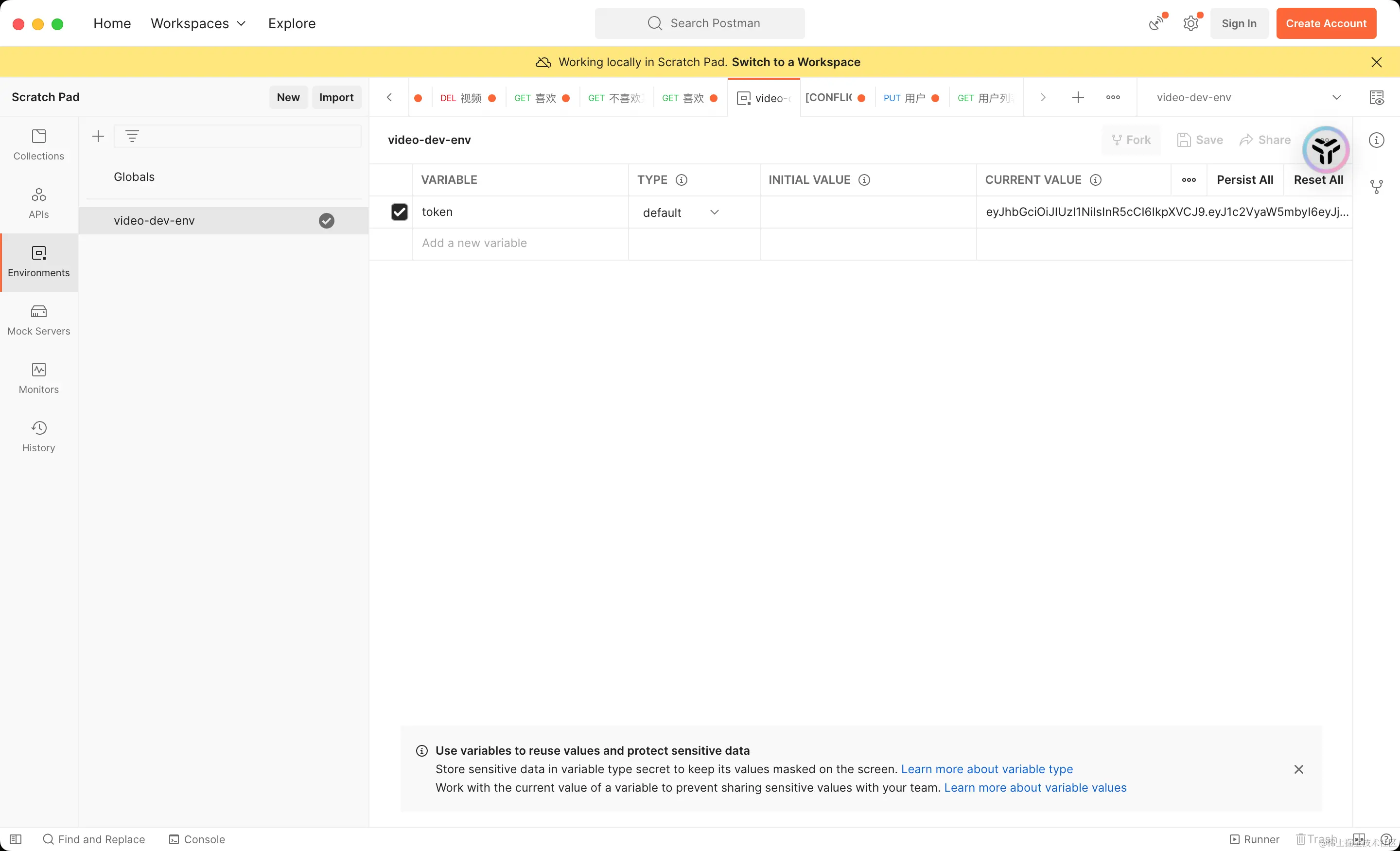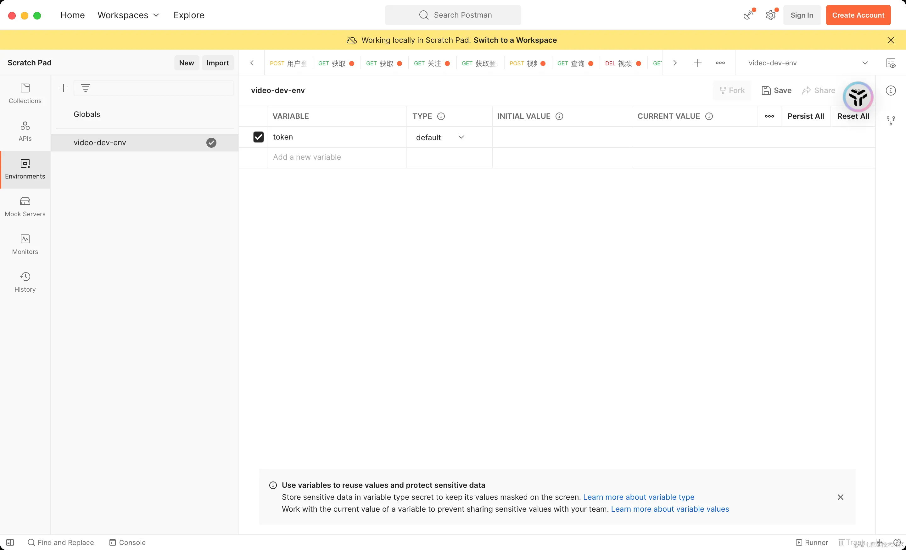 - 在环境设置中,你可以添加各种变量,如