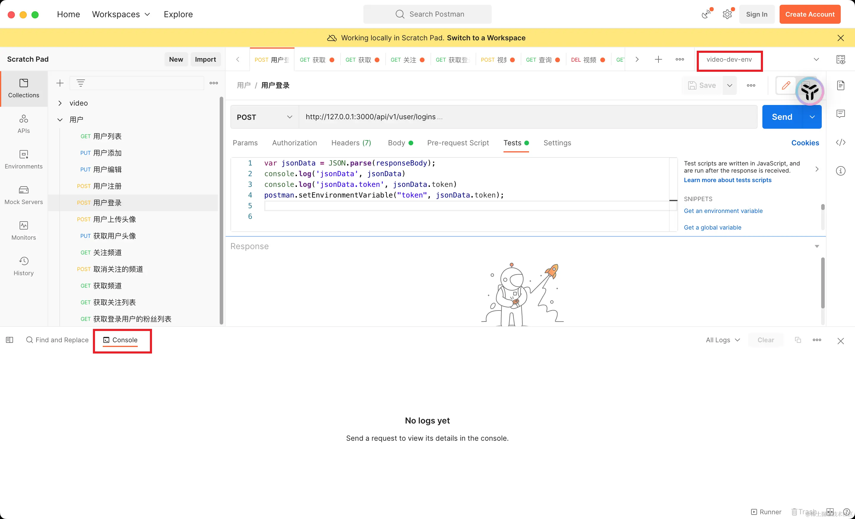 - 在登录请求的“Tests”选项卡下,编写JavaScript代码来获取响应中的token,并更新环境变量。