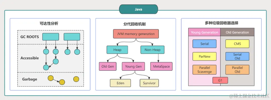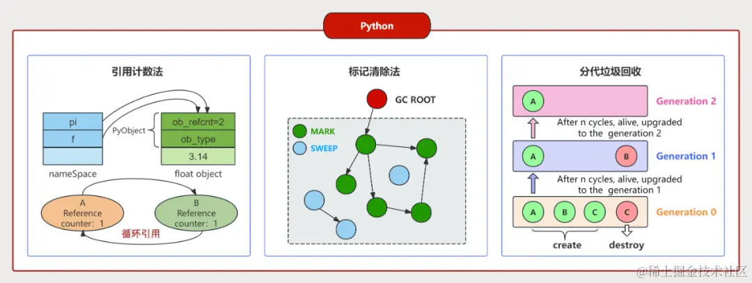 不同编程语言在实现思路上有相似之处,又各自有不同的侧重点,接下来我们对比 Python、Java 和 Go 的 GC 机制来展开聊聊。
