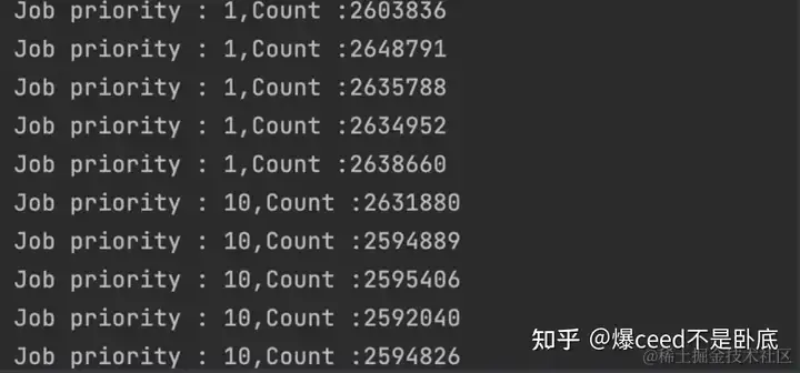 通过上面运行的结果我们发现,priority设置10的线程可能反而还没有设置1的线程执行次数多,这就表明了程序正确性不能依赖线程的优先级高低。