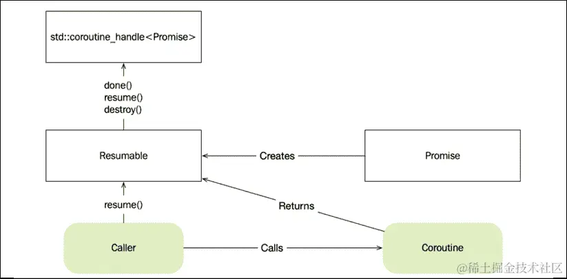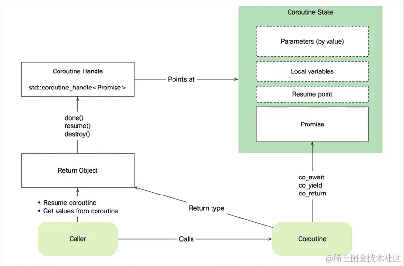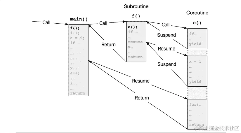 在 C++中,使用关键字co_await和co_yield标记显式的挂起点。下面的图表显示了协程如何从一个子例程中调用,然后稍后从代码的不同部分恢复: