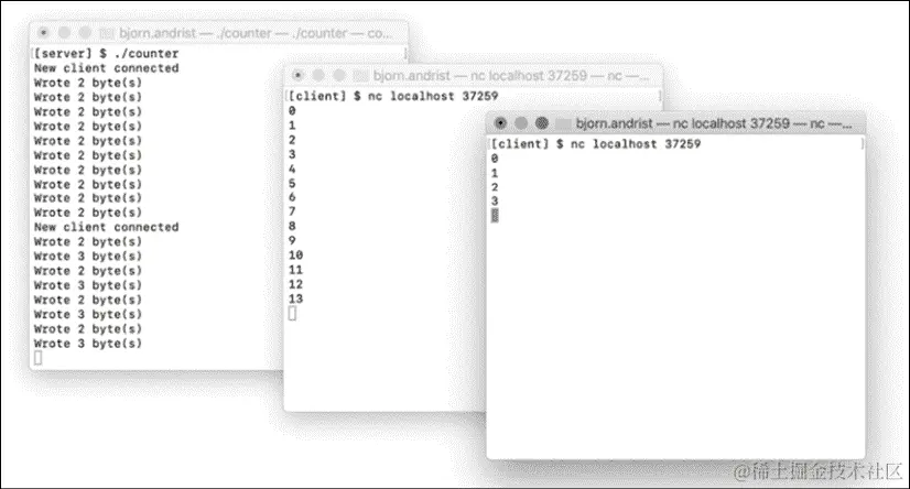 我们可以启动多个客户端,它们都将由专用的serve_client()协程调用来提供服务,并且拥有自己的递增计数变量的副本,如下面的屏幕截图所示: