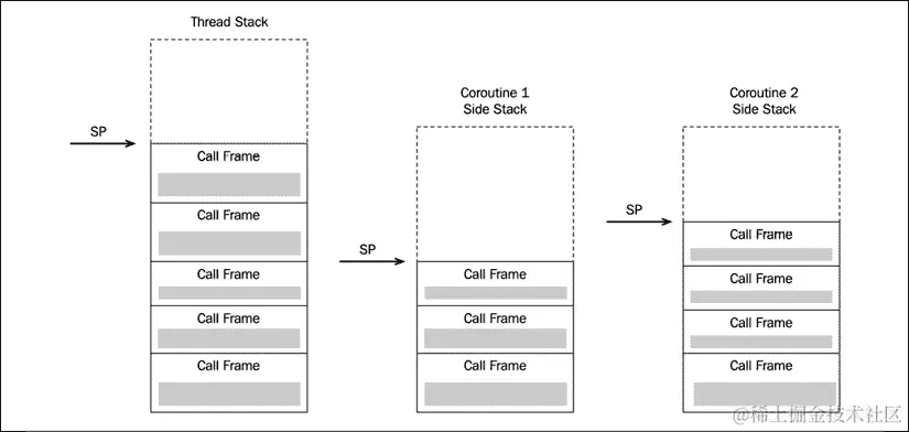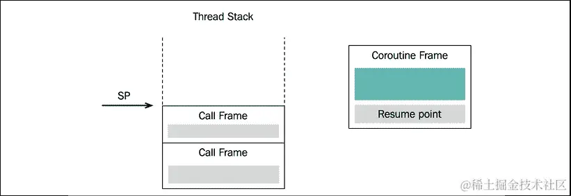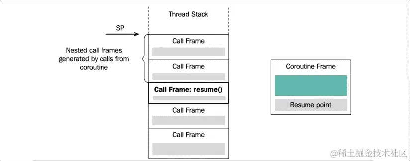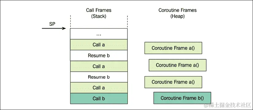 图 12.2:协程的调用可以挂起和恢复。协程调用在被挂起时保持其内部状态。