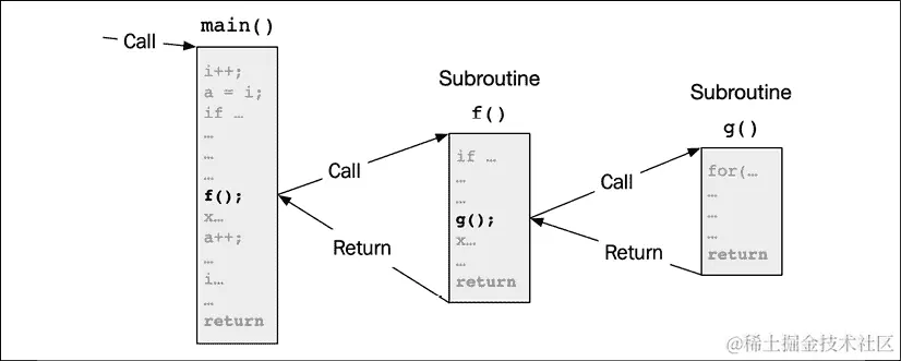 子例程的调用链是严格嵌套的。在接下来的图表中,子例程f()在子例程g()返回之前无法返回到main():