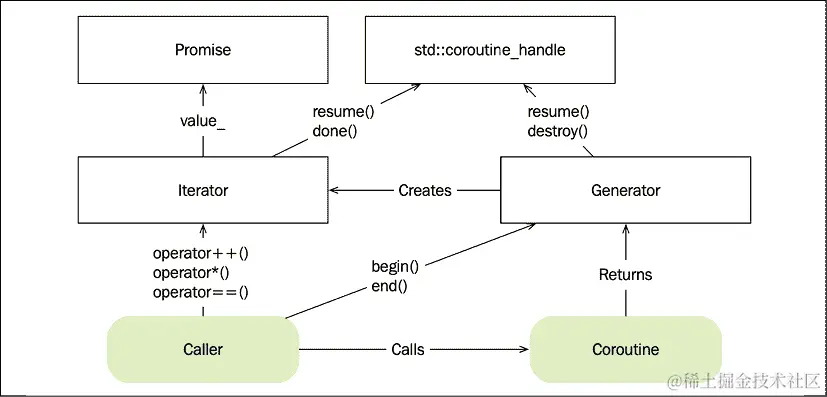 在前面的示例中,iota()和take_until()是协程。iota()生成一个整数序列,take_until()在找到指定值之前产生值。Generator模板是一种自定义类型,我将在本章后面向您展示如何设计和实现它。