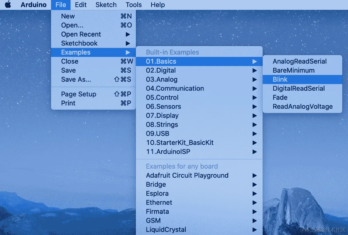 在 Arduino IDE 中,打开文件菜单,选择示例-> 01.基础-> 闪烁。