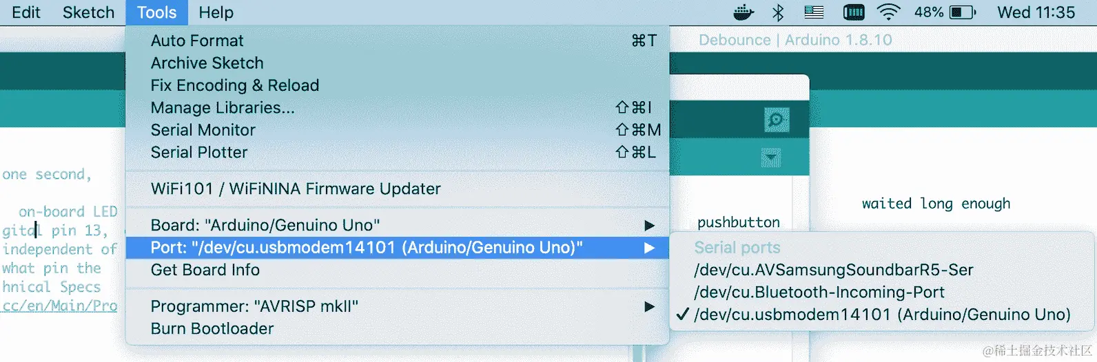 IDE 使用串行接口与板进行通信。由于您的计算机上可能已经配置了多个串行端口,设置通信的步骤之一是选择其中一个可用的端口。通常,它是带有 Arduino 名称的端口: