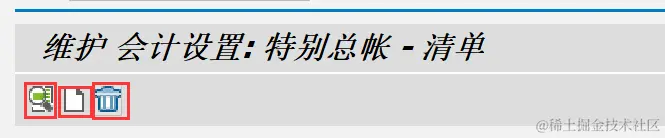 后台配置的事务码类型繁多,这里我们选择一个通用的事务码【T-CODE: FBKP】,既可以创建客户账户类型的SGL标识,也可以创建供应商账户类型的SGL标识。进入配置屏幕后,在应用工具栏中,有三个按钮选项,可以进行查看、创建、删除操作,如下图所示: