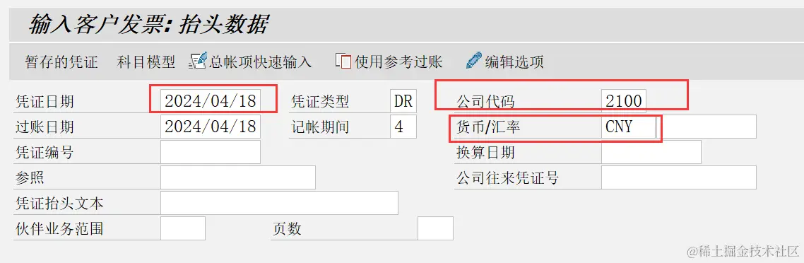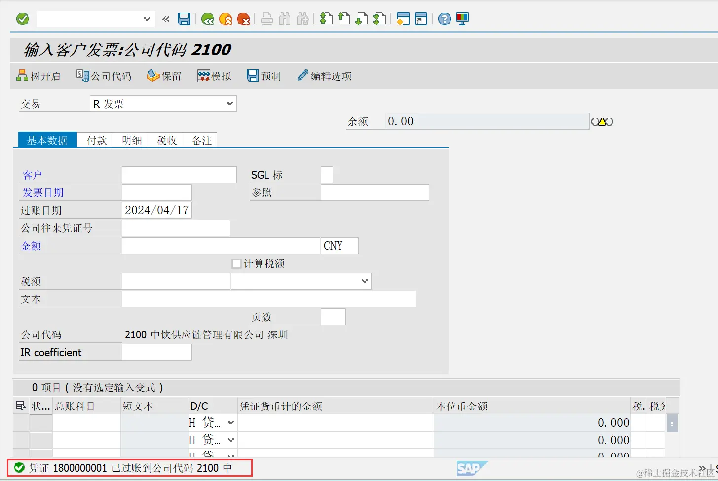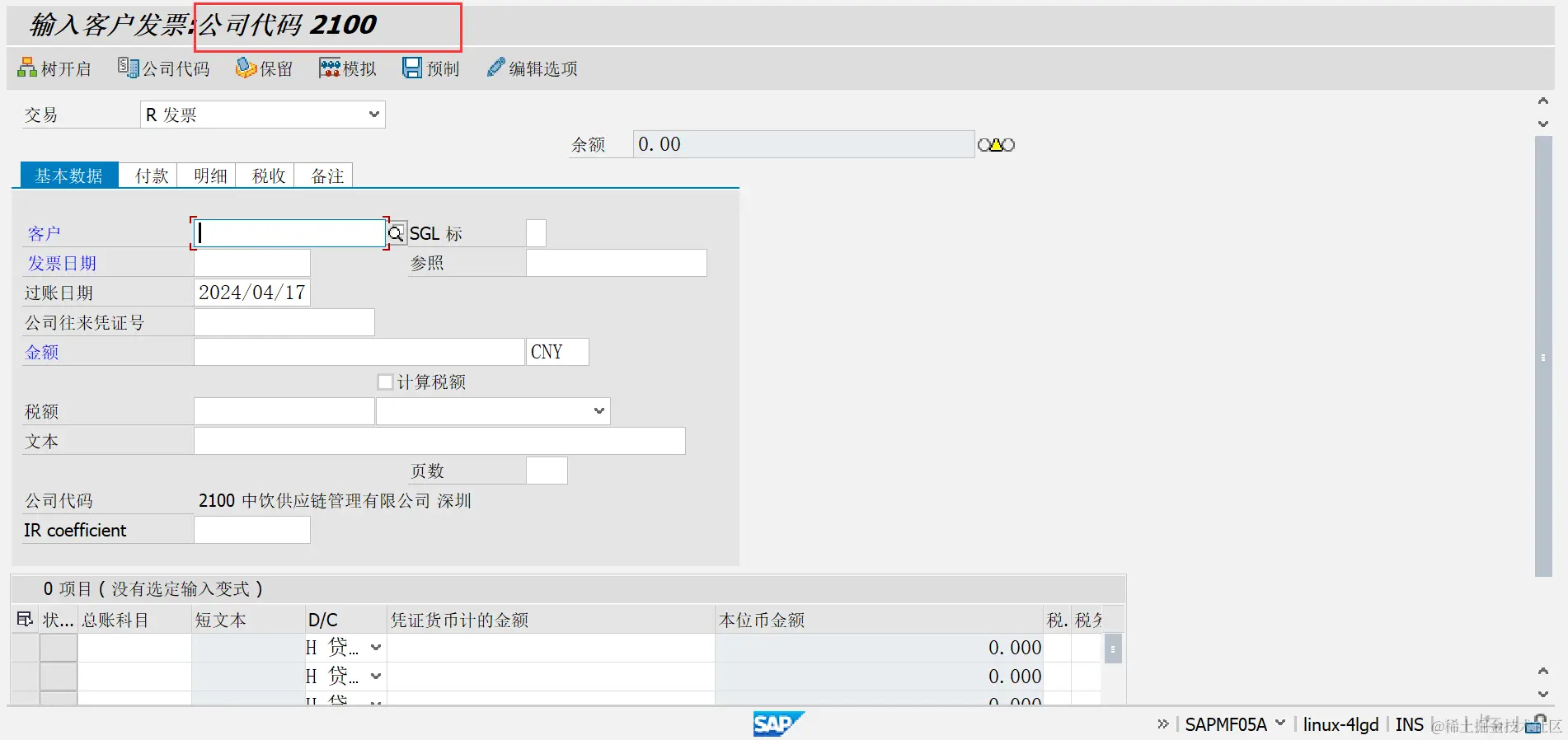 输入【T-CODE: FB70】 进入【输入客户发票】屏幕 ,选择公司代码2100。