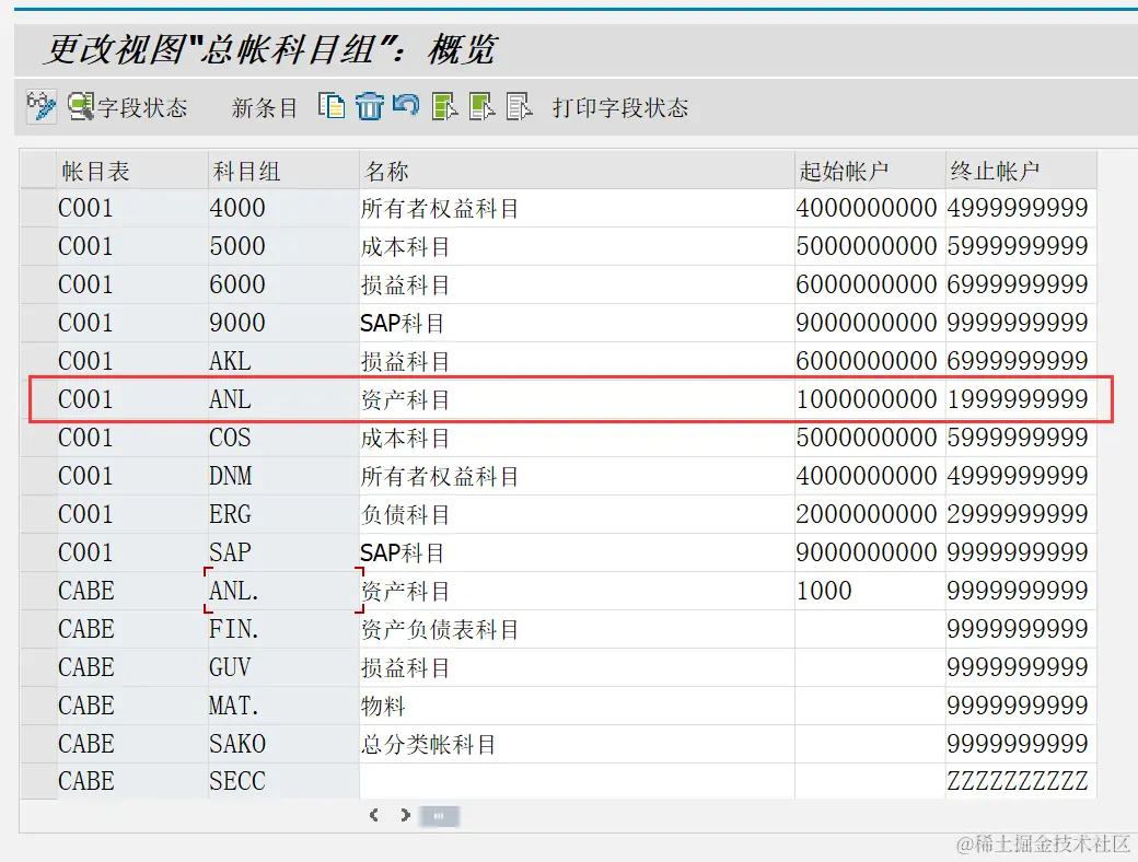 输入事务码【T-CODE: OBD4】,进入【更改试图"总账科目组":概览】屏幕,找到应收账款和应收票据所设置的科目组。这里我的两个科目都属于资产类,在后台配置了名为ANL的科目组用于资产类科目字段显隐的控制。