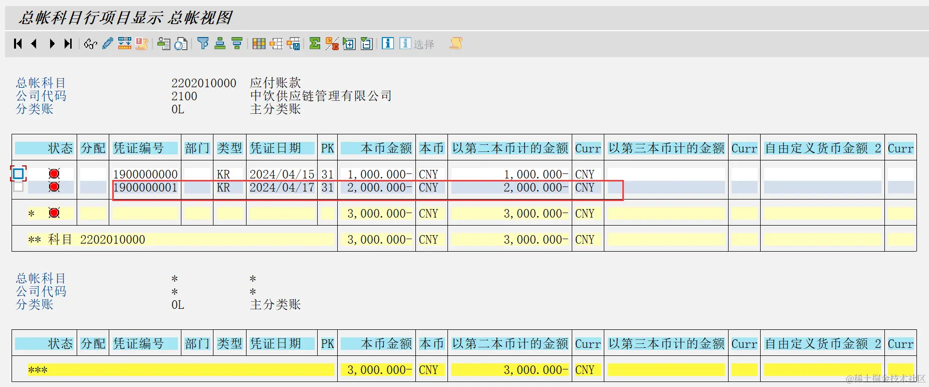 查询应付账款余额的操作同应收账款一样,不过是将科目代码变化了一下,在此不再进行赘述,直接放出详细的金额行项目: