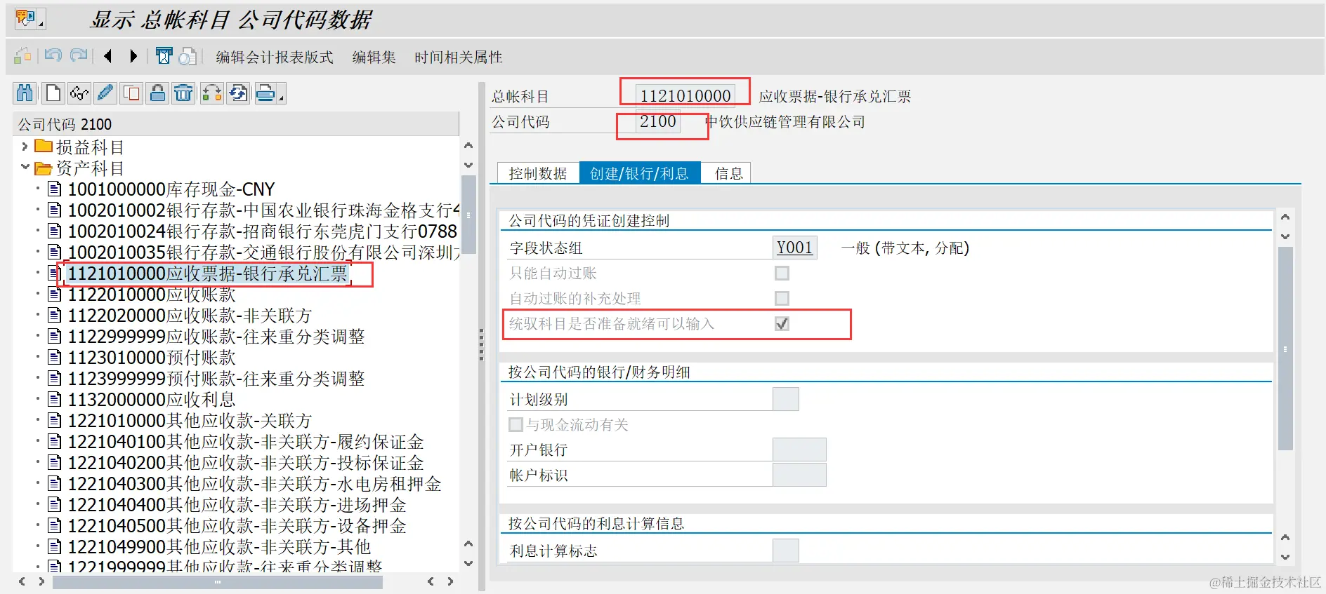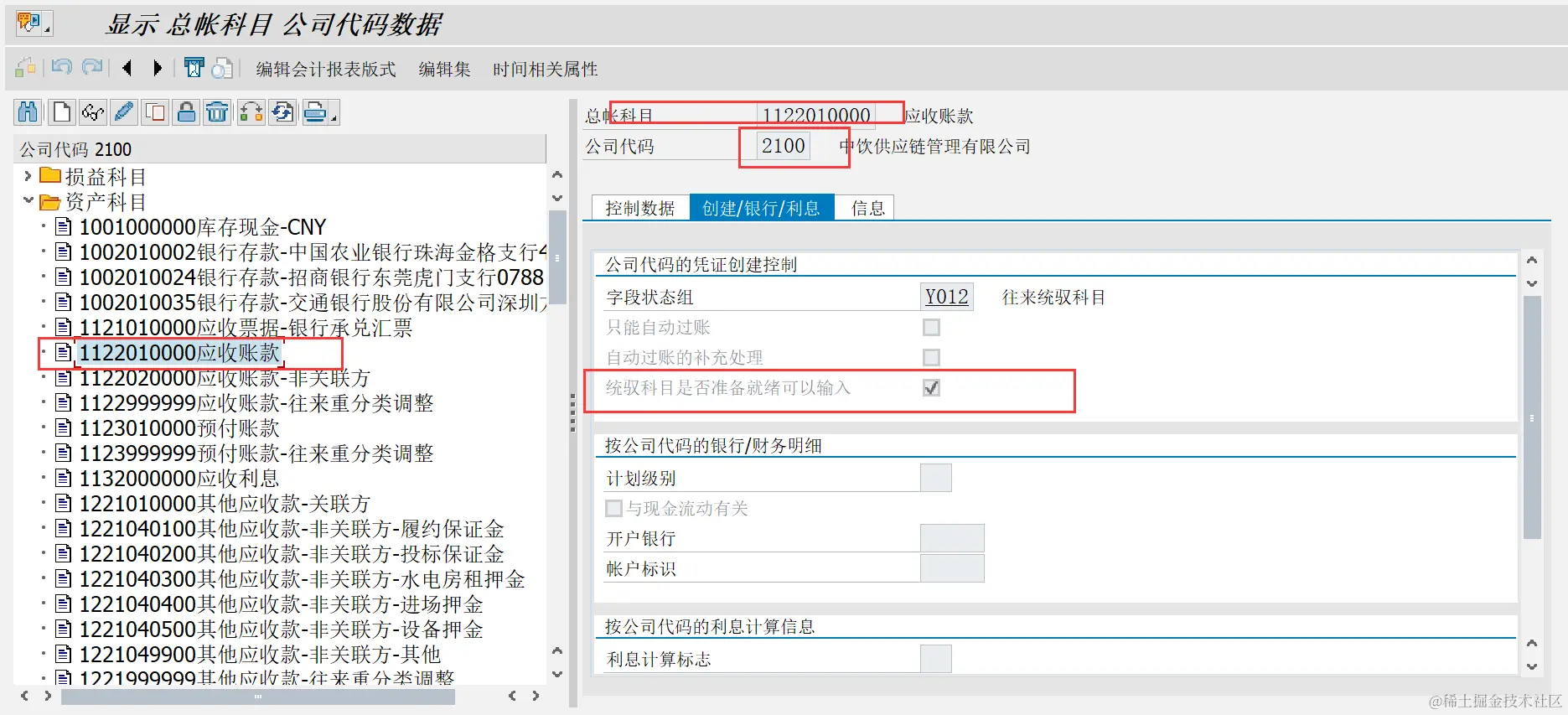 首先,我们需要输入【T-CODE: FSS0】进入【显示 总账科目 公司代码数据】屏幕,该屏幕用于会计科目在公司代码层下的维护。找到我们之前为客户设置的标准统驭科目1122010000(应收账款),转到创建/银行/利息页签,确保勾选了统驭科目是否准备就绪可以输入复选框。