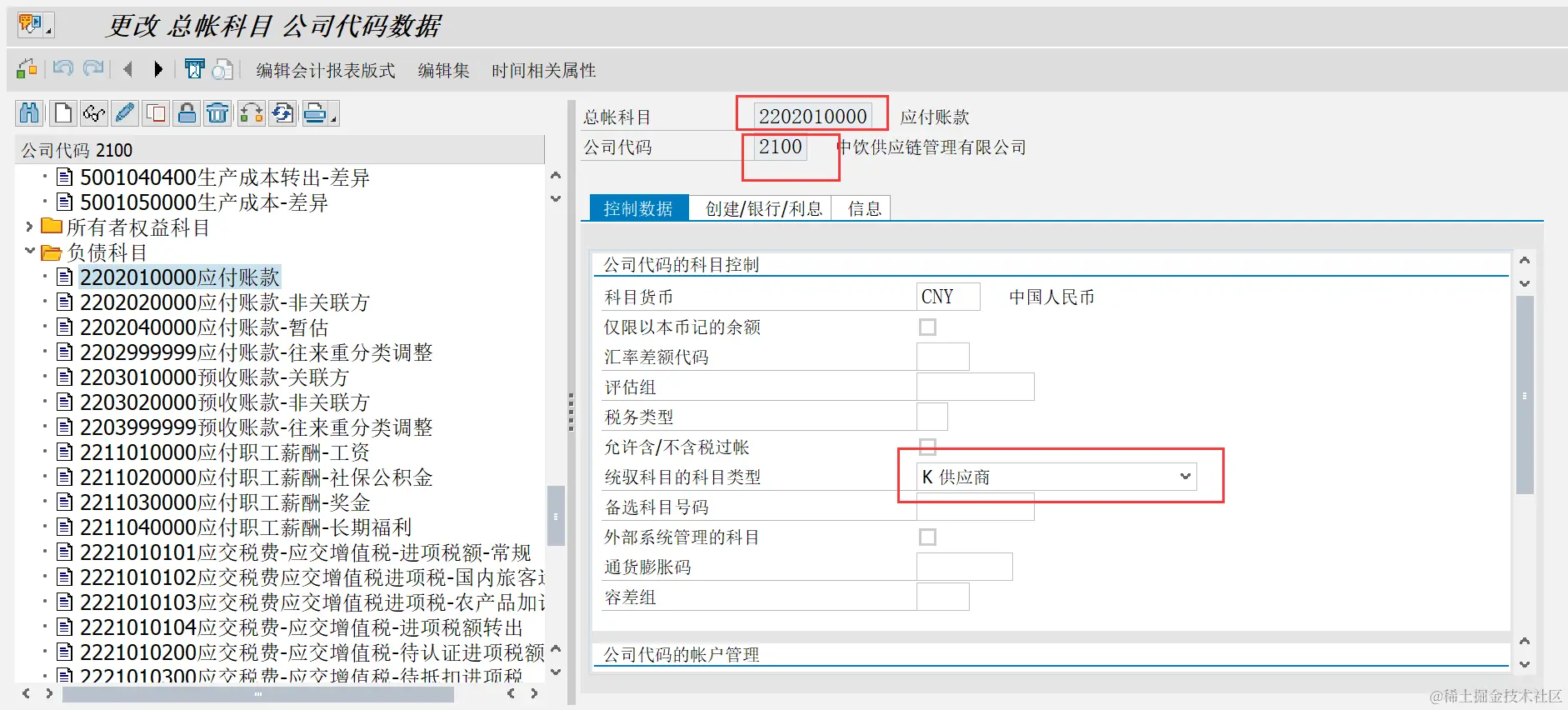 对于应付账款科目,执行上述相同操作,不过需要将其统驭科目的科目类型设置为"K 供应商"