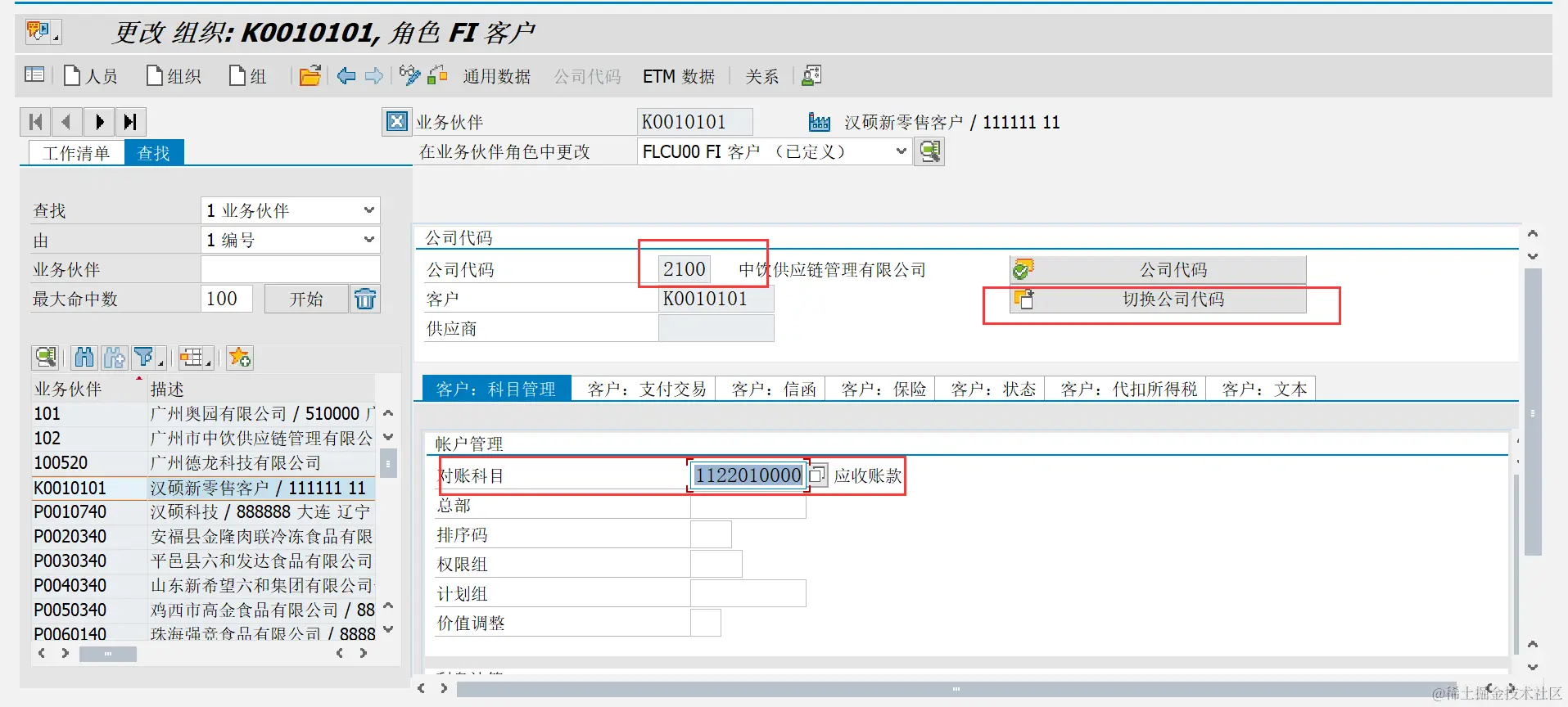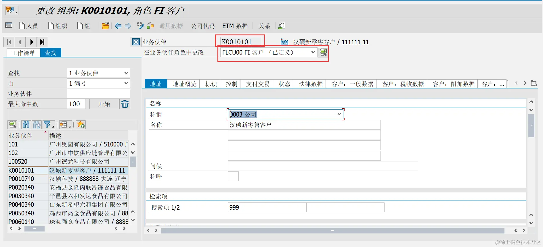 输入【T-CODE:BP】 进入【维护商业伙伴】屏幕,选择我们对应的商业伙伴,选择其角色为FLCU00 FI 客户