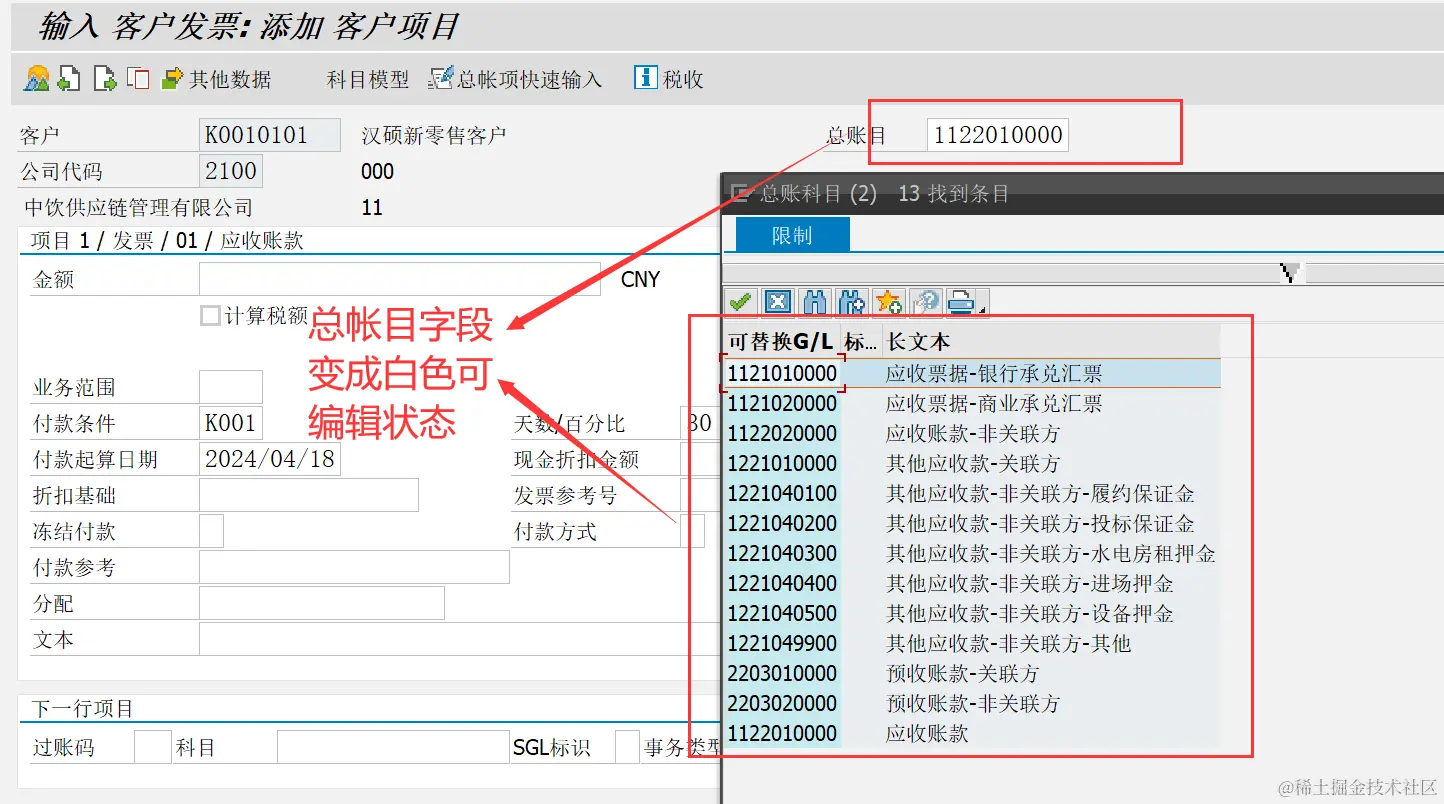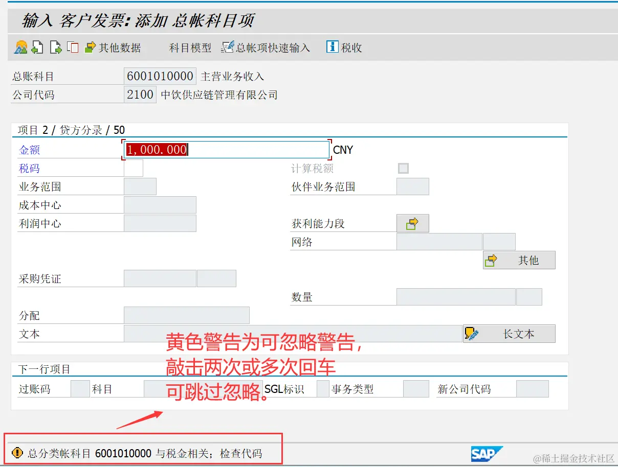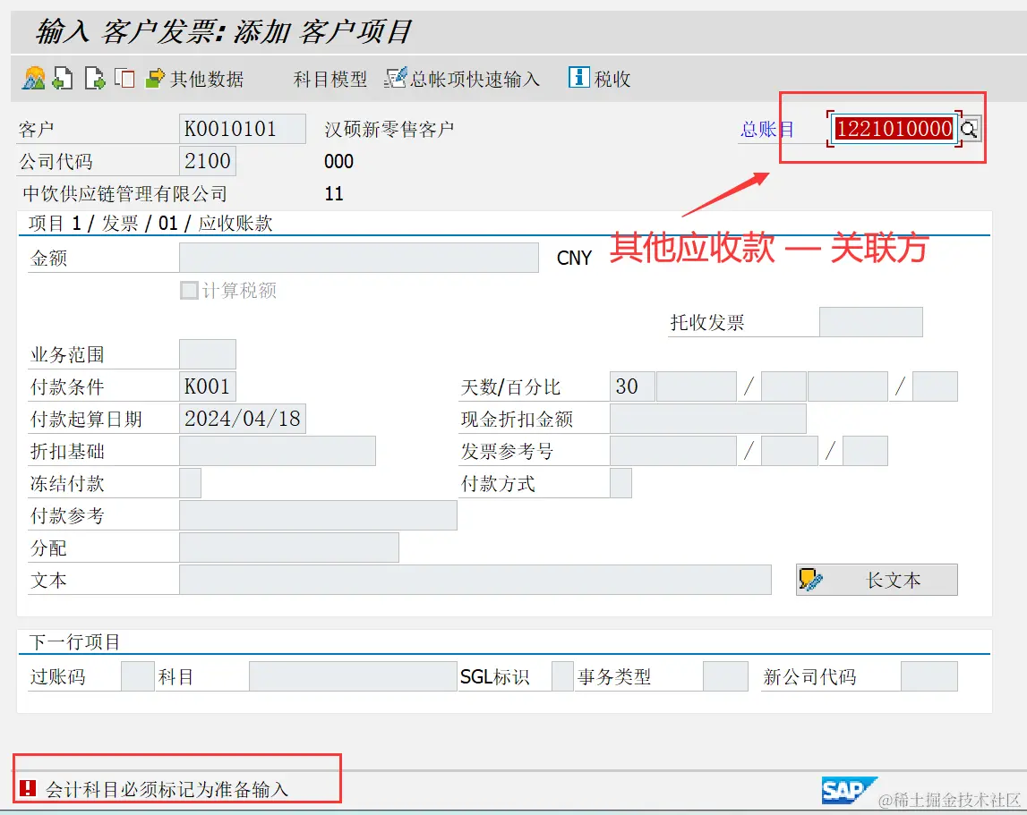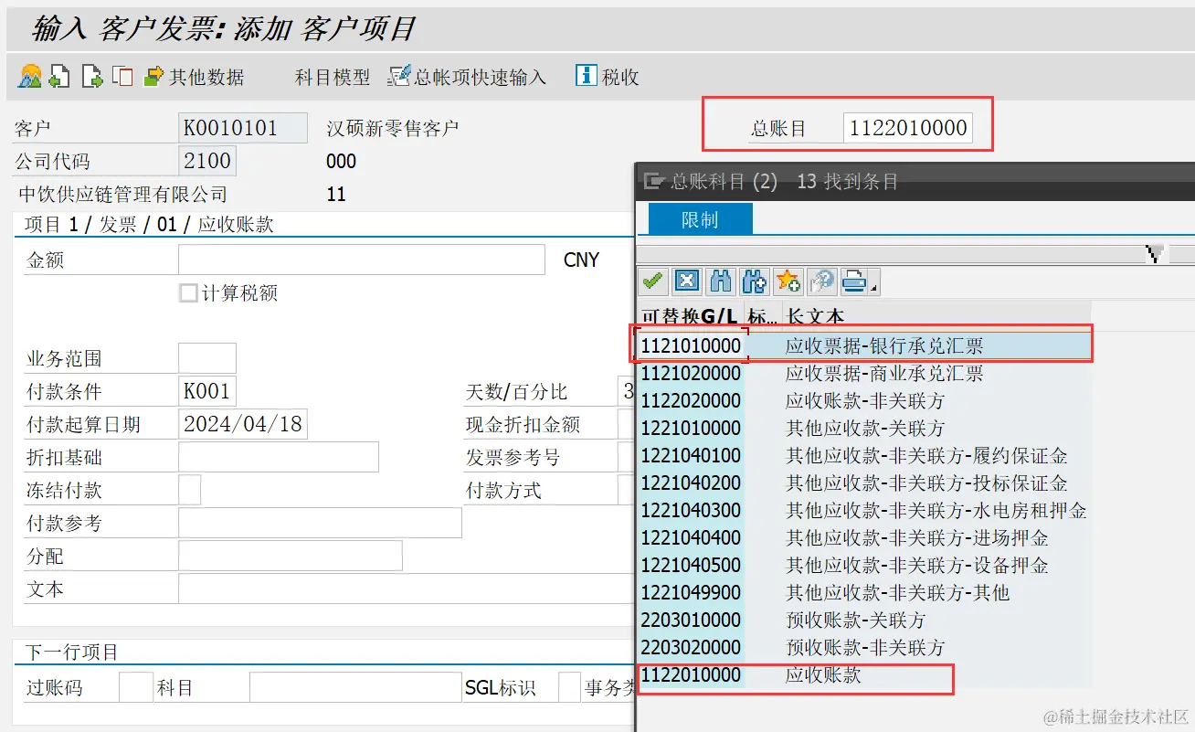 01,在总账科目字段中,虽然系统默认显示的是标准的统驭科目,但用户此时拥有选择权,可以手动选择一个不同的备选统驭科目来进行记账(如下图所示:),而不是使用客户或供应商主数据中预设的统驭科目。