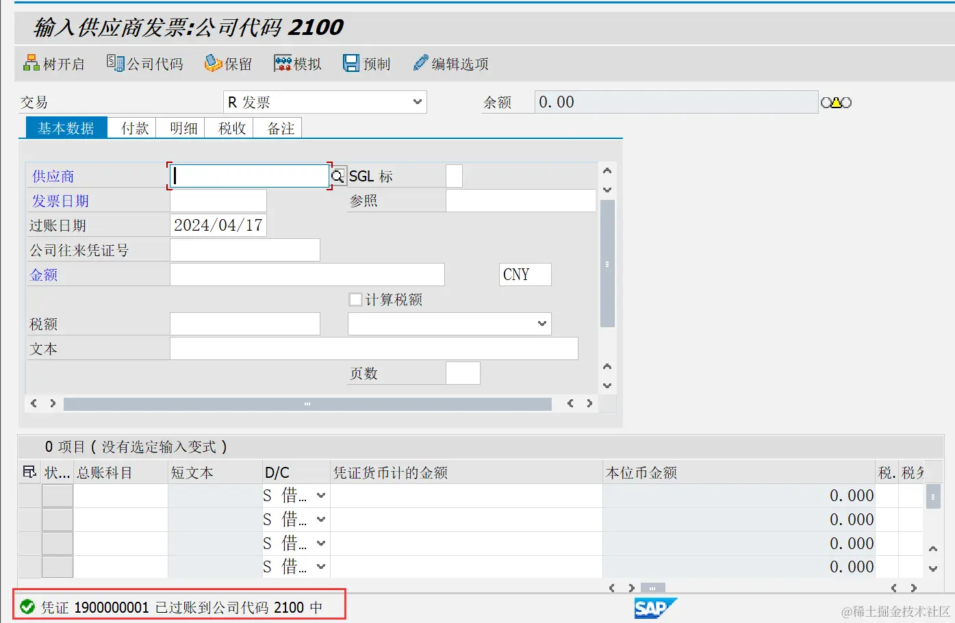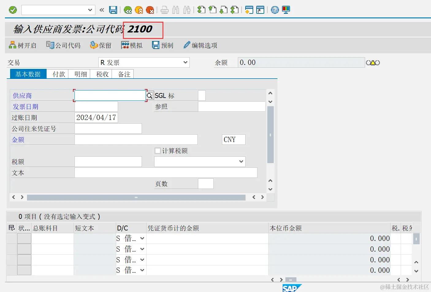 输入【T-CODE: FB60】 进入【输入供应商发票】屏幕 ,选择公司代码2100。