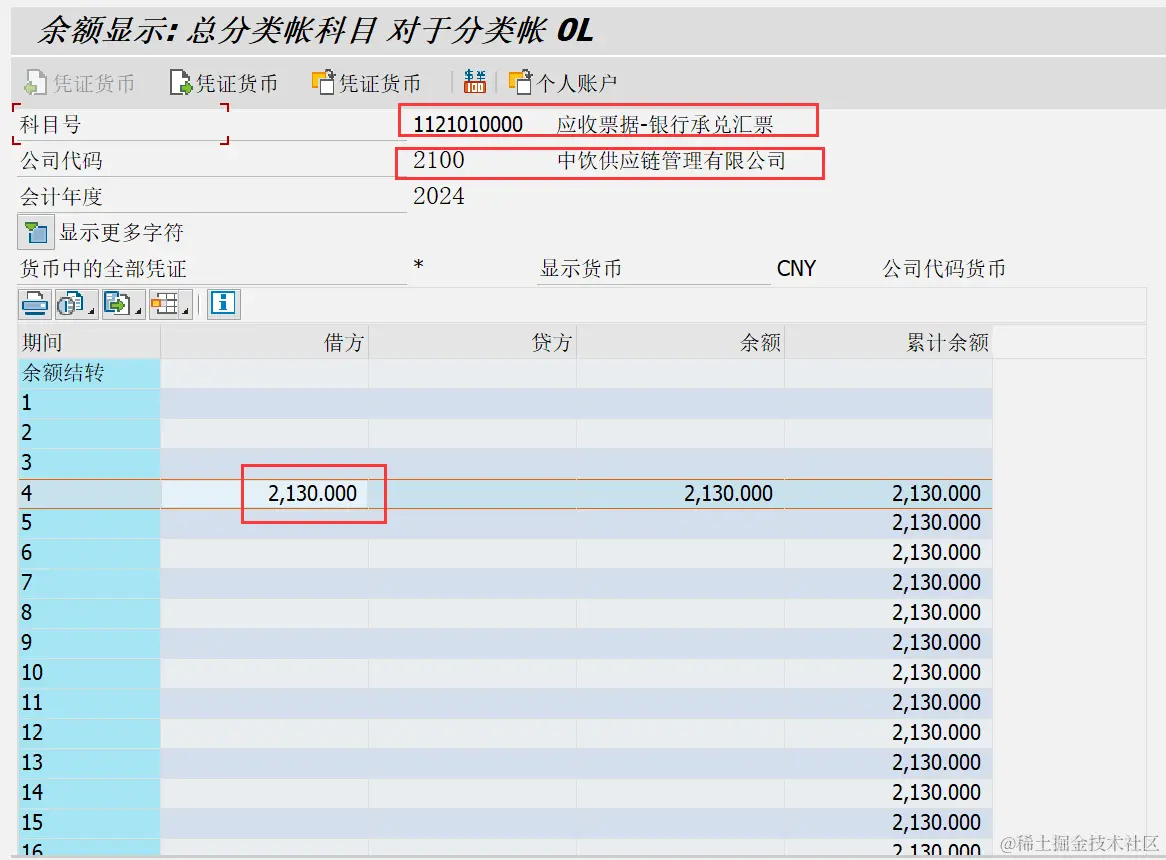 从上图可以看到,应收账款的借方余额是2130,鼠标单击便可以进去查看更加详细的行项目,如下图所示。