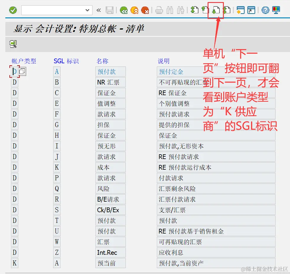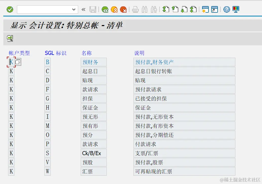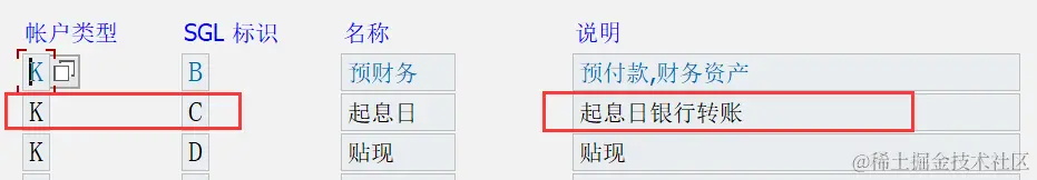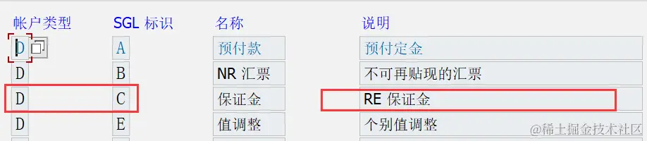 不同的账户类型可以配置相同的SGL标识,例如对于相同的SGL标识A,对应客户账户类型(D)来说,系统预设为RE保证金;但是对于供应商账户类型(K) 来说,系统预设为起息日银行转账。