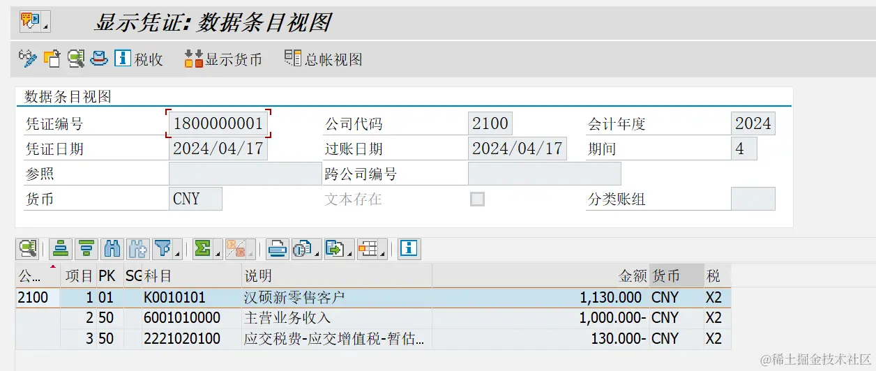 在下一行项目中,输入金额1130,税码X2 13% 销项税,勾选计算税额复选框,菜单栏中通过凭证 — — 模拟路径导航到凭证模拟界面,如下图所示:
