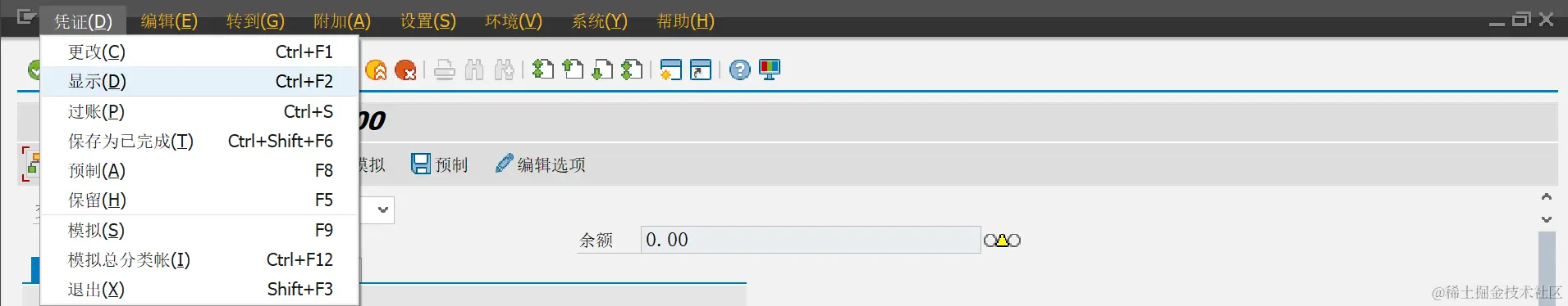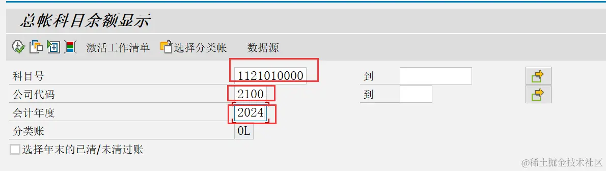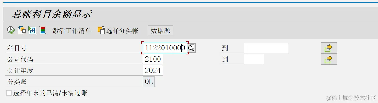 输入【T-CODE: FAGLB03】 进入【总账科目余额显示】屏幕。