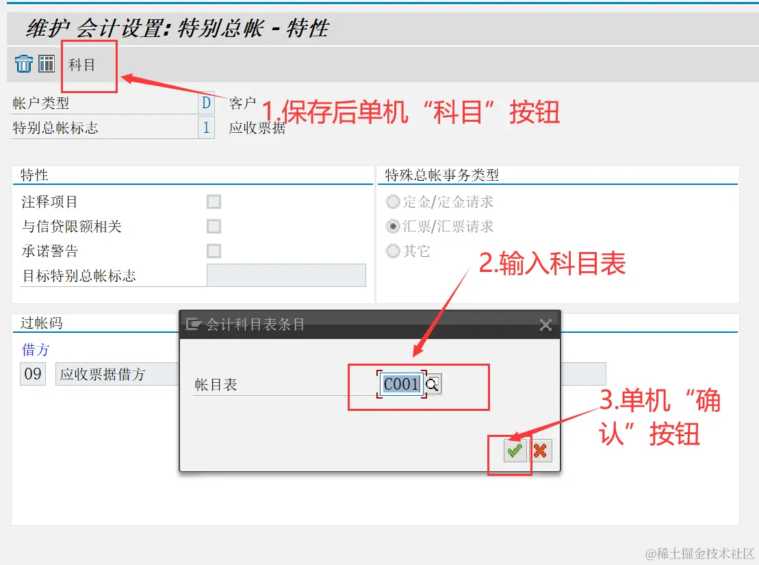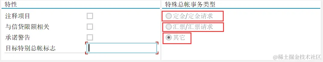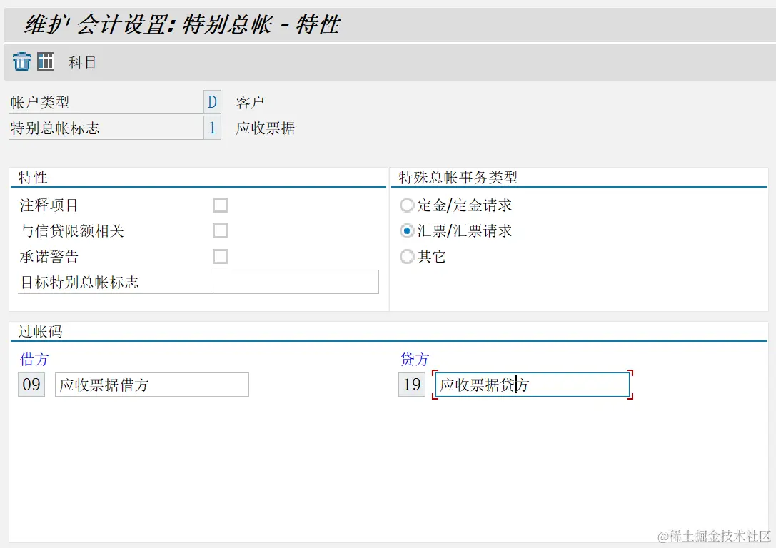 单击绿色确认按钮后,进入【维护 会计设置:特别总账 - 特性】屏幕,将我们的特殊总账事务类型勾选汇票/汇票请求,补充过账码借贷方文本,如下图所示。