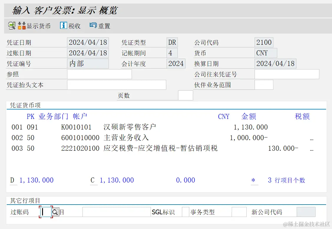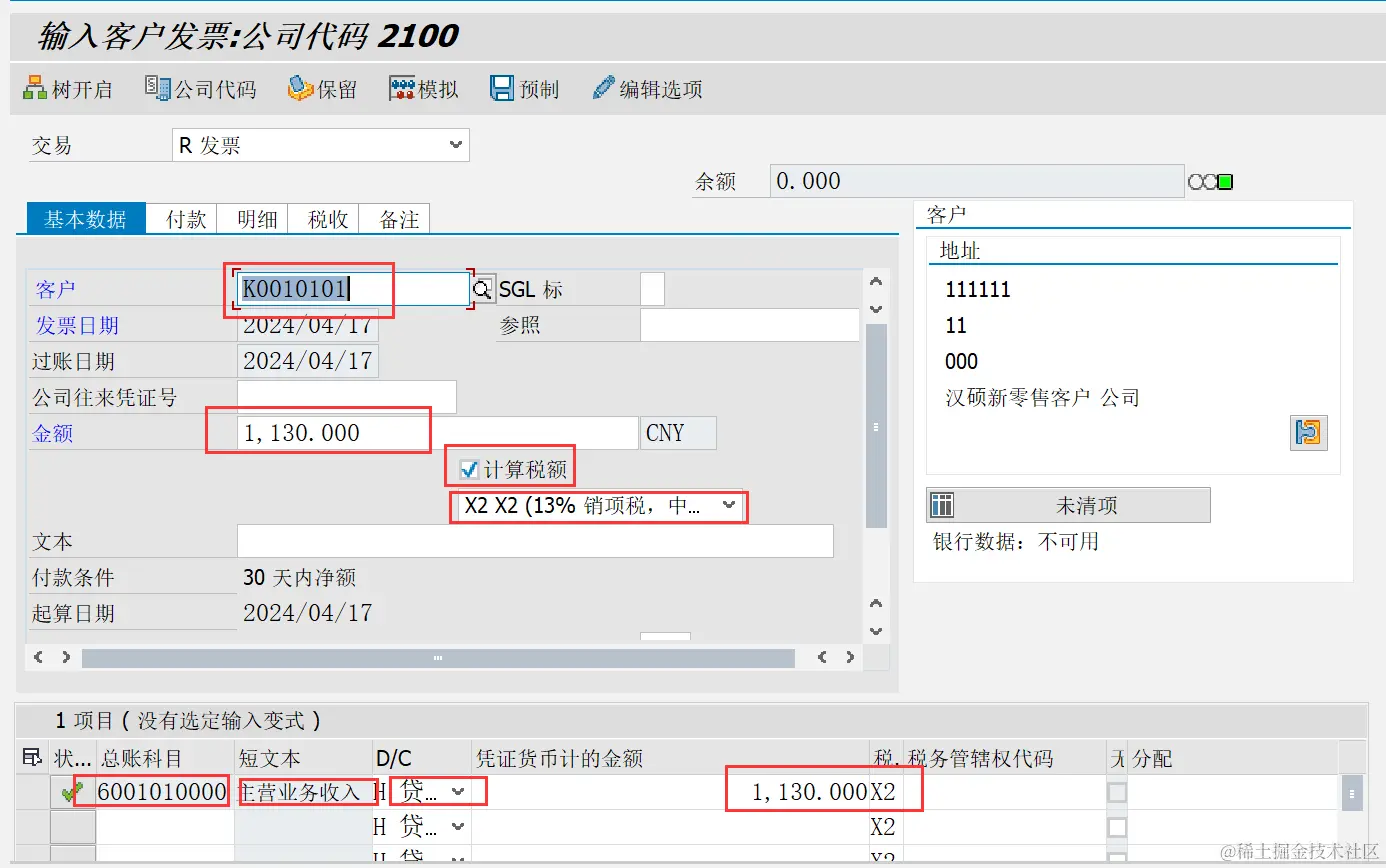 在客户基本数据中输入客户代码k0010101和发票日期(当天),金额1130,勾选计算税额复选框,选择税率为X2销项税率,13%。在行项目中选择总账科目代码6001010000(主营业务收入),借贷方向为H 贷方,金额1130,税率为X2销项税率,13%。