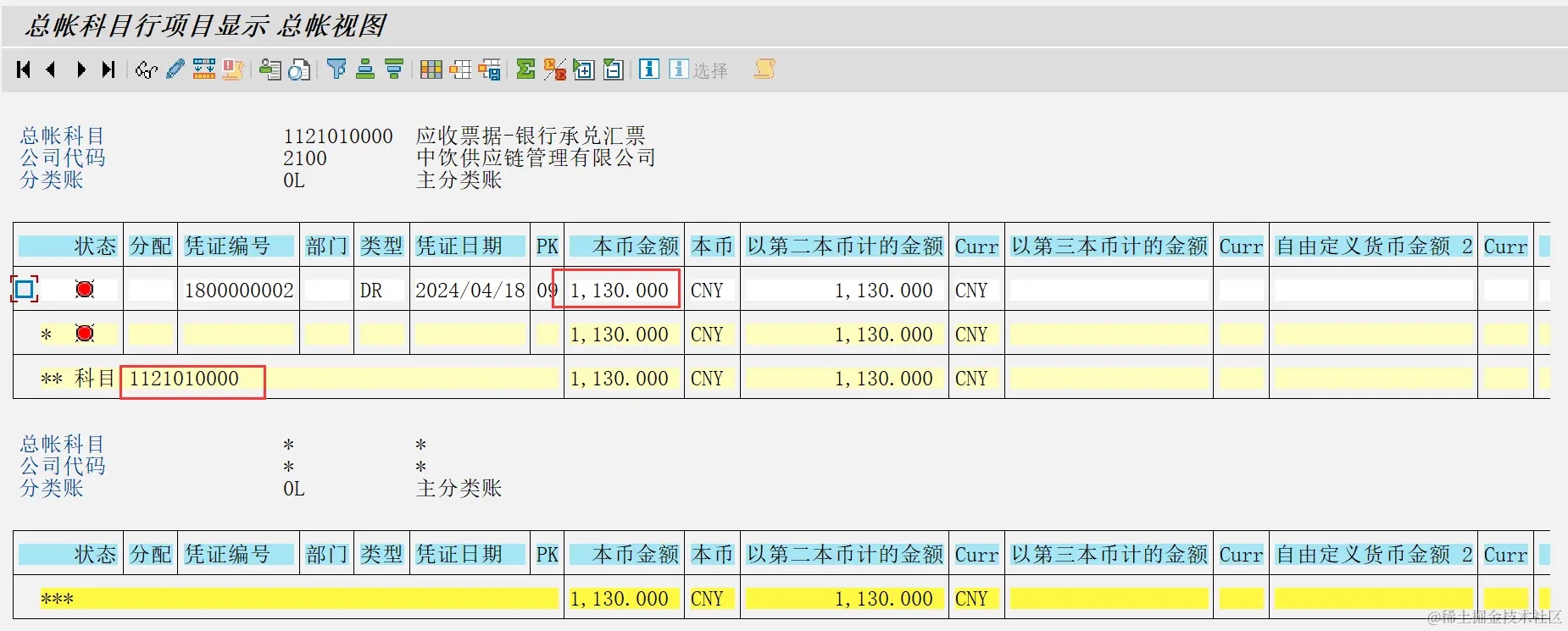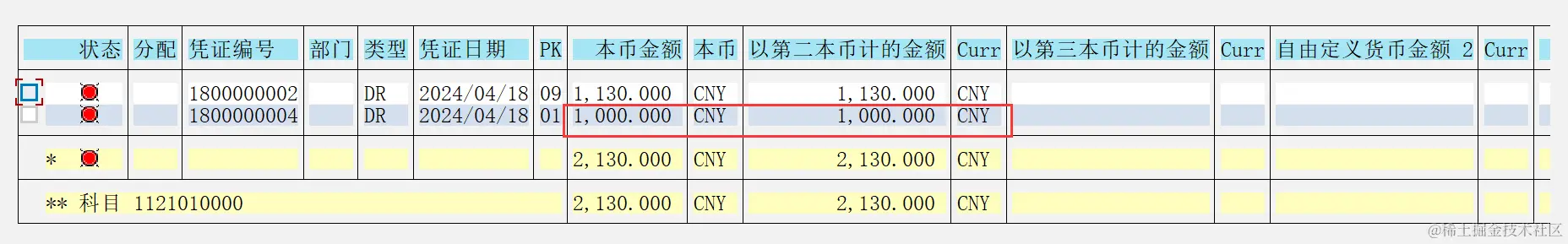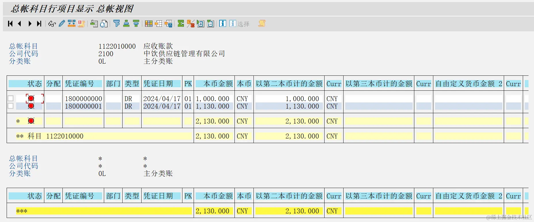 从上图可以看到,应收账款的借方余额是2130,鼠标单机便可以进去查看更加详细的行项目,如下图所示。其中第二行金额为1130的便是我们刚刚记账的那笔业务了。