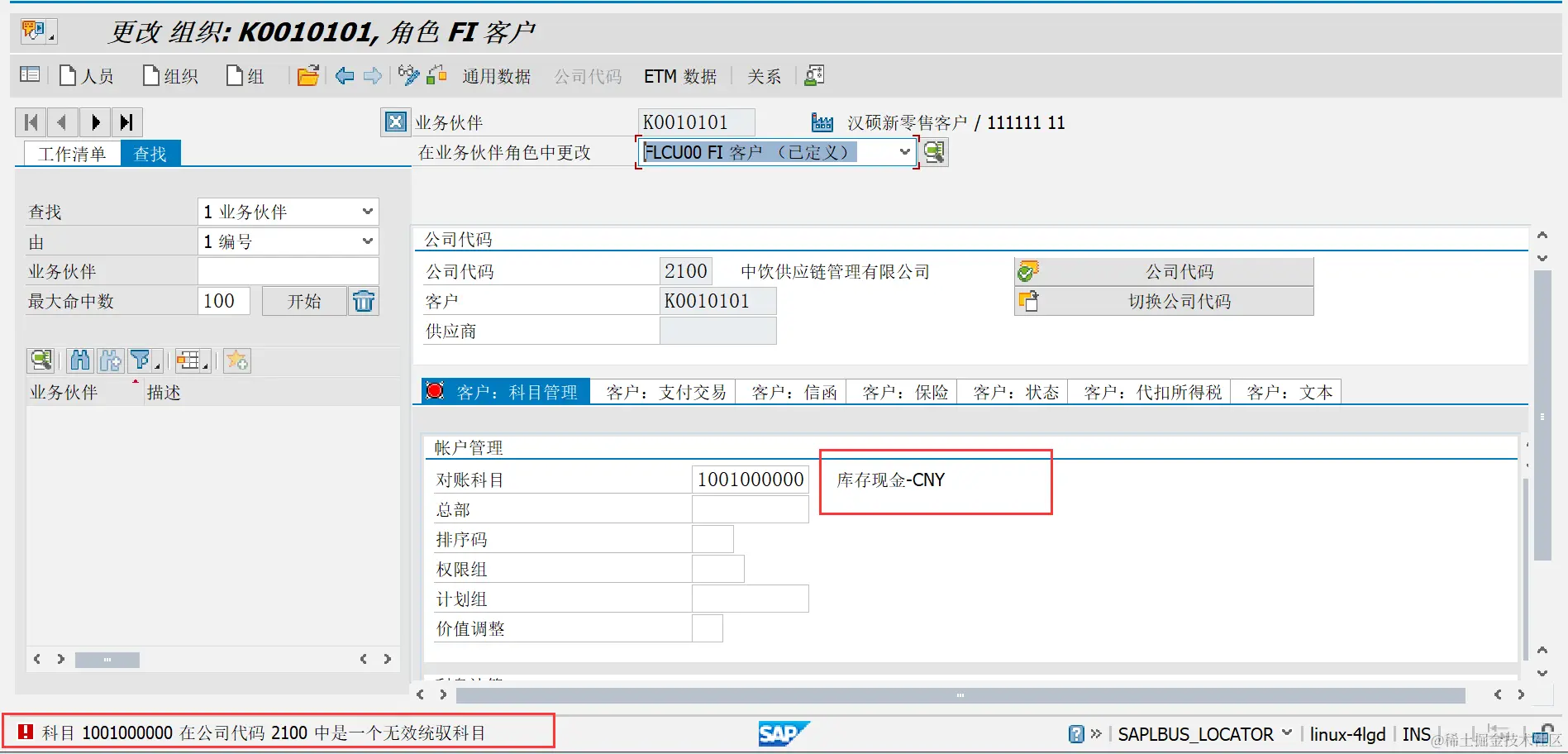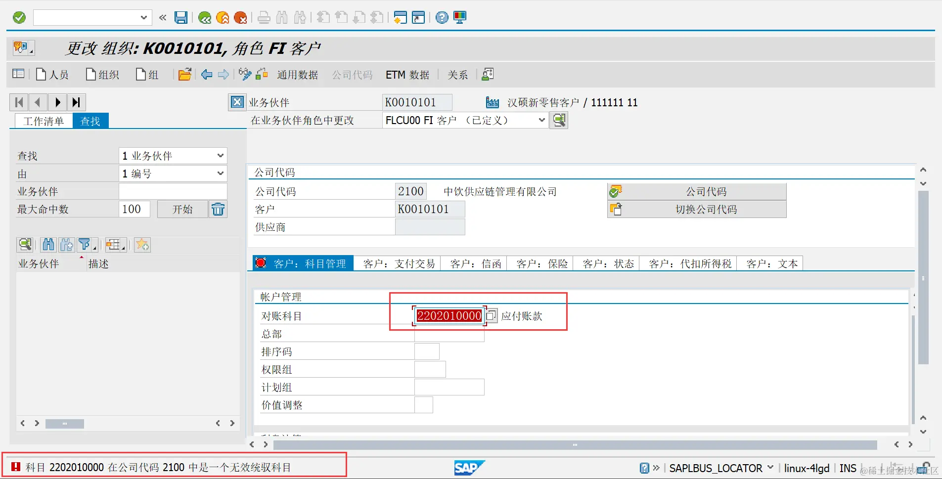K 供应商,则不能用于客户角色的对账科目),会发生如下报错: