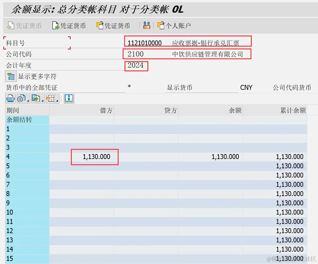 从上图可以看到,应收账款的借方余额是1130,鼠标单机便可以进去查看更加详细的行项目,如下图所示。