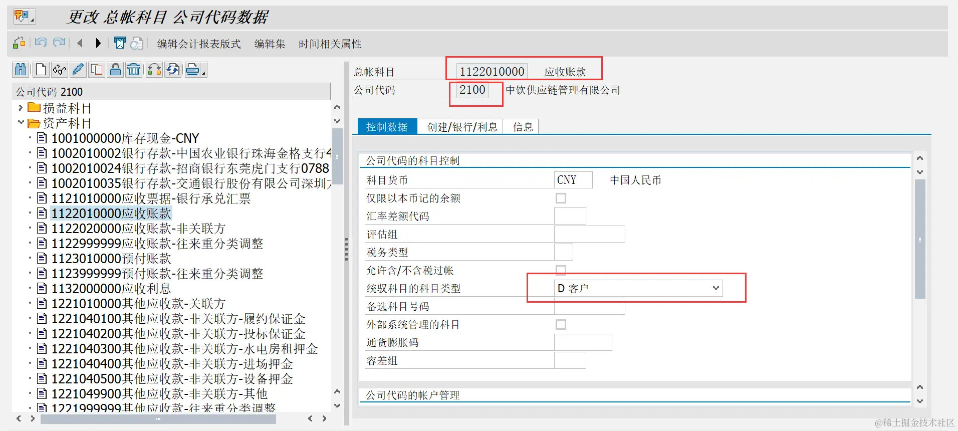 输入【T-CODE:FSS0】 进入【编辑 总账科目 公司代码数据】屏幕,首先指定目标公司代码,这里笔者选择的是2100,确保我们对科目的设置是在正确的公司代码之下。然后找到要设置的科目,设置其统驭科目的科目类型为"D 客户",这里笔者选择的是应收账款。