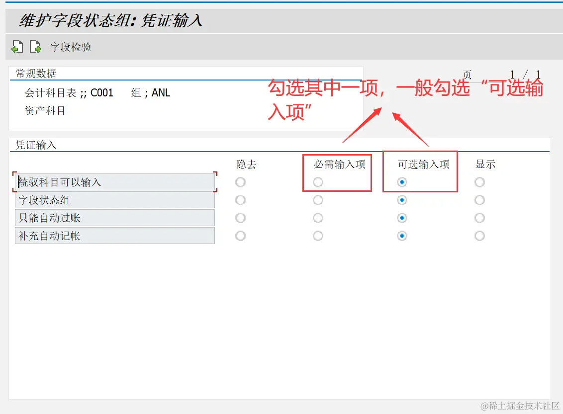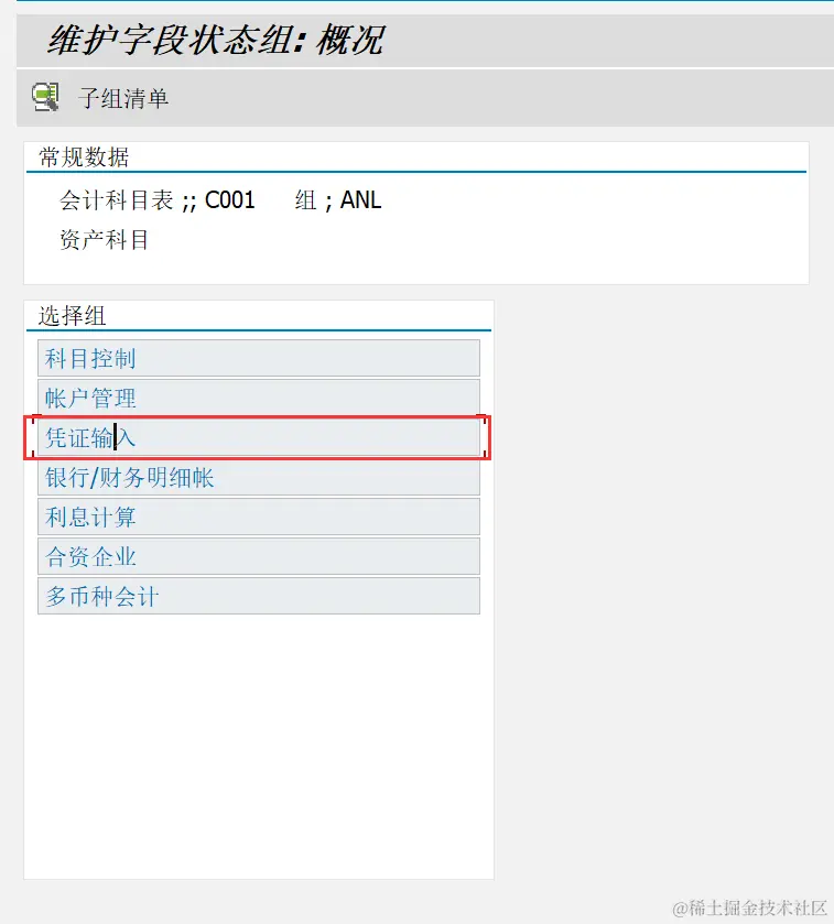 转回正题,我们点击ANL科目组,进入到【维护字段状态组:概况】屏幕,在选择组栏目下,选择屏幕输入,进入到【维护字段状态组:凭证输入】屏幕,