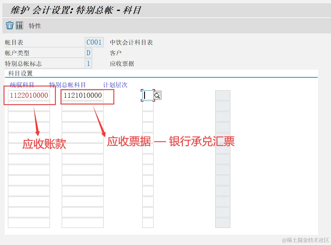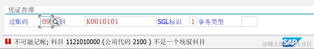 不可能记账;科目 xxx(公司代码 xxx)不是一个统驭科目。这里就要回想到我们上面所介绍的知识点了,我们的特别总账科目必须是一个统驭科目才行,这里是因为在科目表的公司代码层下对于2100公司代码的1121010000科目(应收票据 — 银行承兑汇票)没有设置其统驭科目类型为D 客户。