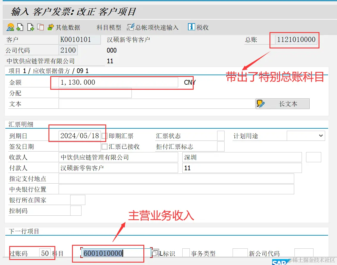 当我们全部都正确设置完毕后,重新进入事务码,按照上述信息正确填写后,回车确认便会成功进入到【输入 客户发票:添加 客户项目】屏幕,可以看到,我们的总账科目已经被替换为了1121010000(应收票据 — 银行承兑汇票)而不是其默认的统驭科目1122010000(应收账款)。