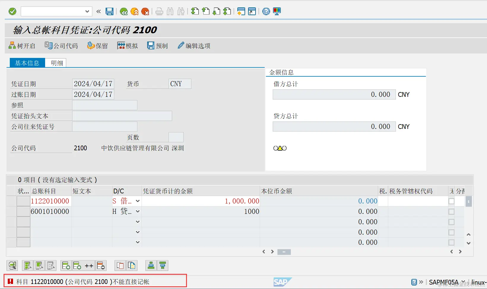 报错信息:科目 xxx (公司代码 xxx)不能直接记账