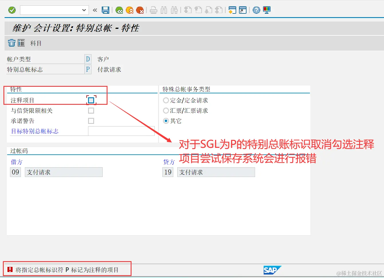P的特别总账标识默认自动勾选注释项目,且不允许修改,否则系统会报错,如下图所示: