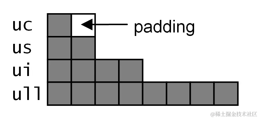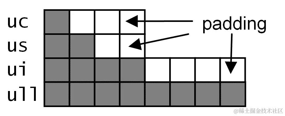以下显示了在 x86 机器上使用sizeof运算符确定的这些类型的实际大小:
