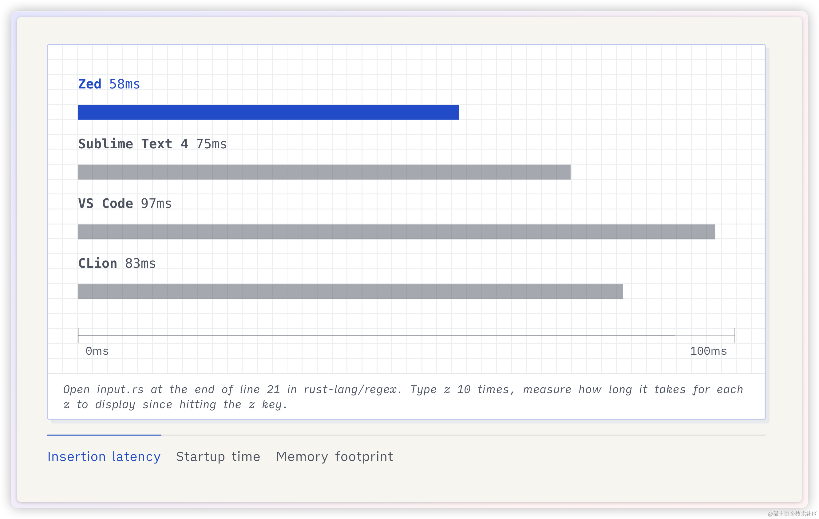 输入字母 z 并显示到屏幕,Zed 仅需 58 毫秒,而 VS Code 需要 97 毫秒