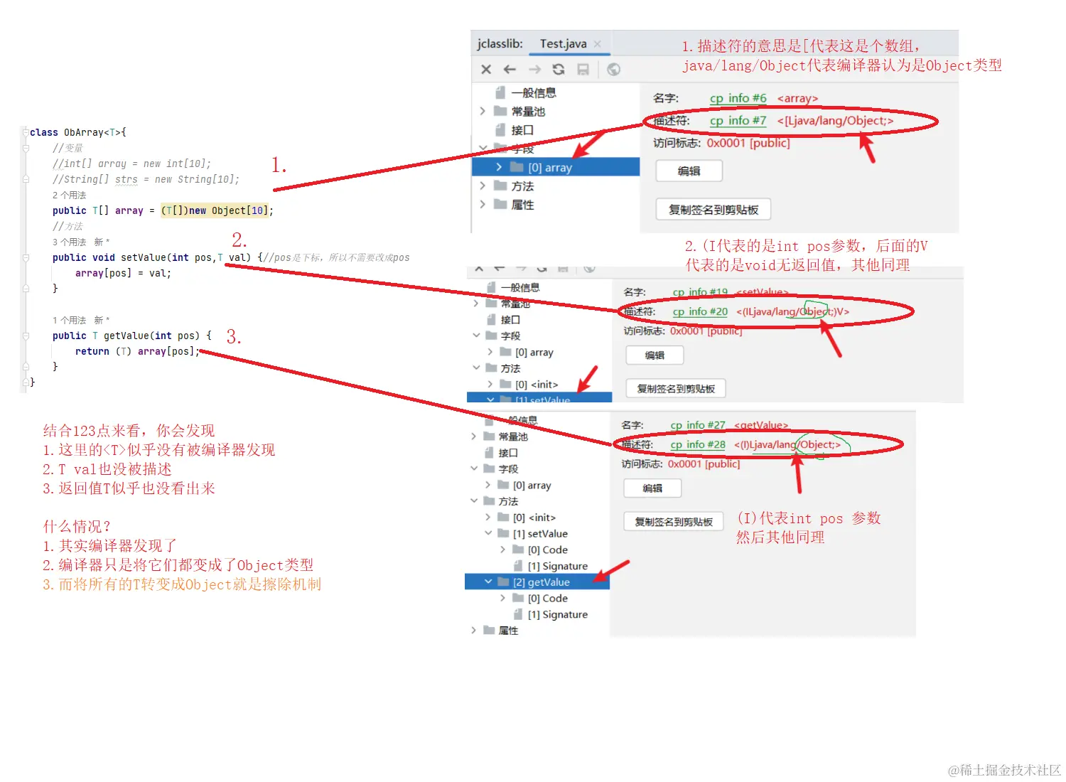 通过命令:javap -c 查看字节码文件,所有的T都是Object