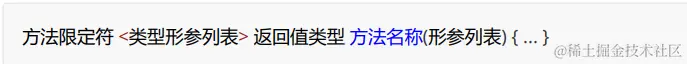 //方法限定符 <类型形参列表> 返回值类型 方法名称(形参列表) { ... }