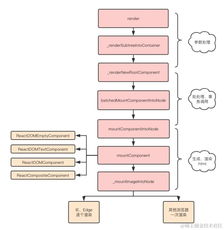 - ReactDOM.render将生成好的虚拟DOM渲染到指定容器上,其中采用了批处理、事务等机制并且对特定浏览器进行了性能优化,最终转换为真实DOM