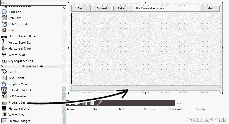 接下来,我们需要一个进度条来显示用户当前页面加载的进度。为此,首先我们需要在 Web 视图下方放置一个进度条部件: