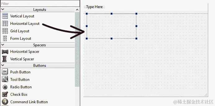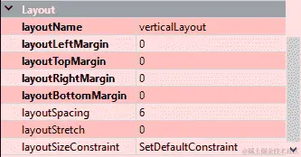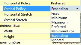 完成后,让我们将水平布局小部件拖放到 QFrame 对象上方。现在我们可以看到水平布局小部件和 QFrame 对象的大小是相同的,我们不希望这样。接下来,选择 QFrame 对象,并将其垂直策略设置为 Expanding: